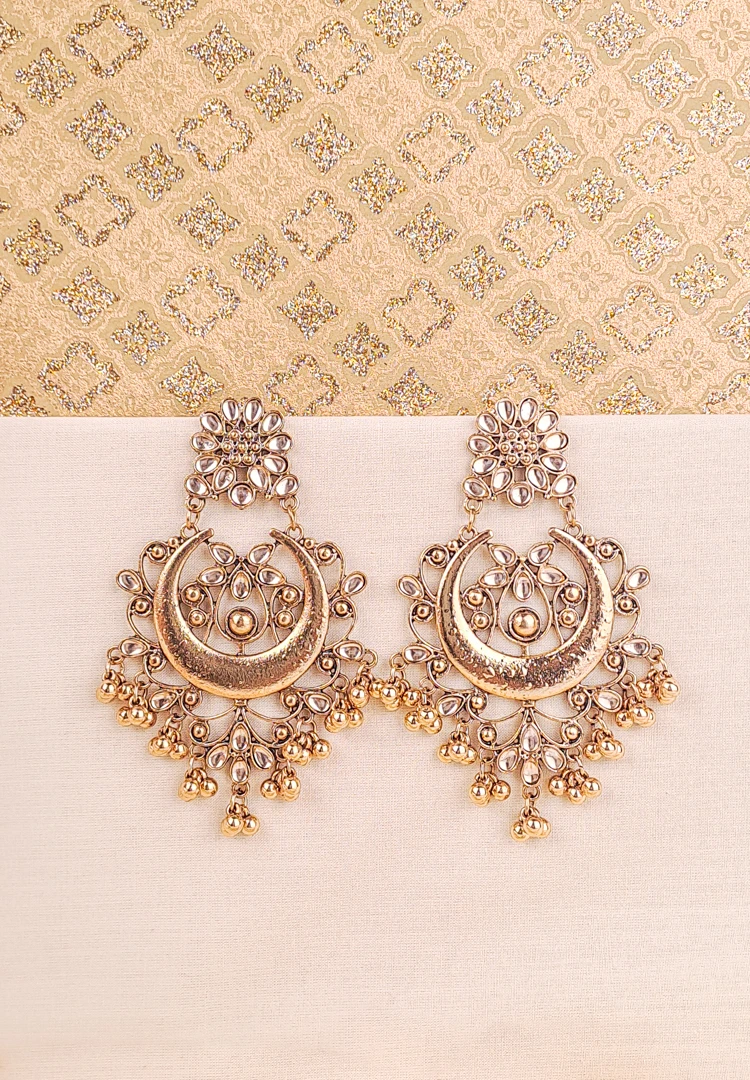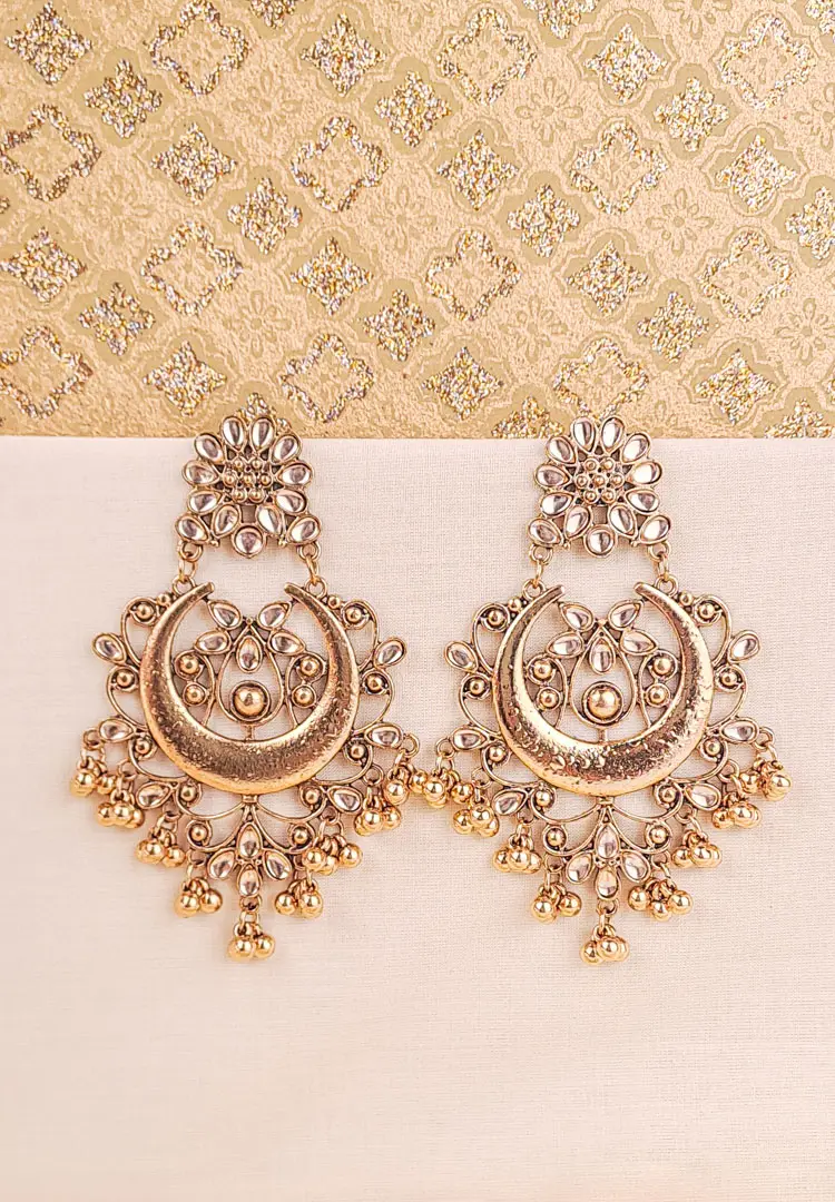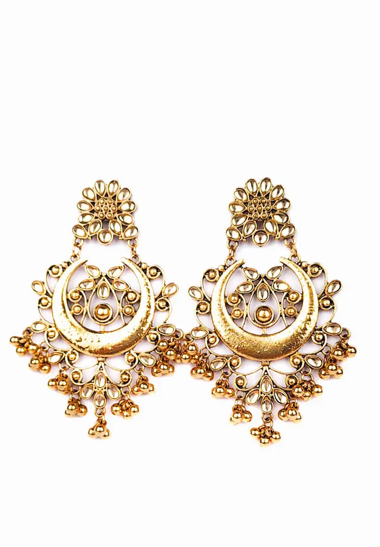 The Kundan Crescent Chandelier is a dazzling blend of traditional artistry and modern elegance. Designed in a crescent-shaped silhouette, this statement earring features intricate Kundan-style detailing accented with vibrant enamel and gold-toned finish. The ornate structure showcases floral and peacock-inspired motifs, while delicate dangling beads at the base add graceful movement. Perfect for weddings, festive occasions, or elegant soirées, this piece embodies timeless grandeur with a touch of contemporary flair.