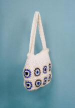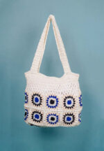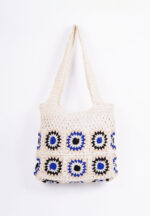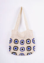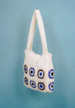Crochet tote bag featuring a bright white base with intricate black cream and blue granny square patterns with wide sturdy crochet straps and a zipper lock