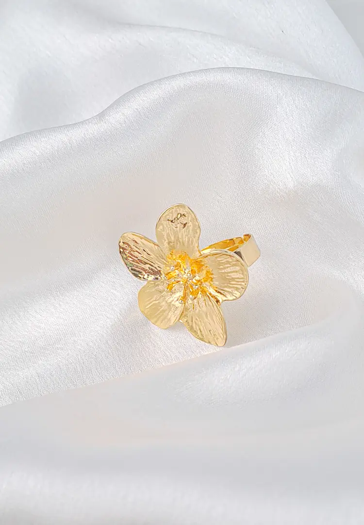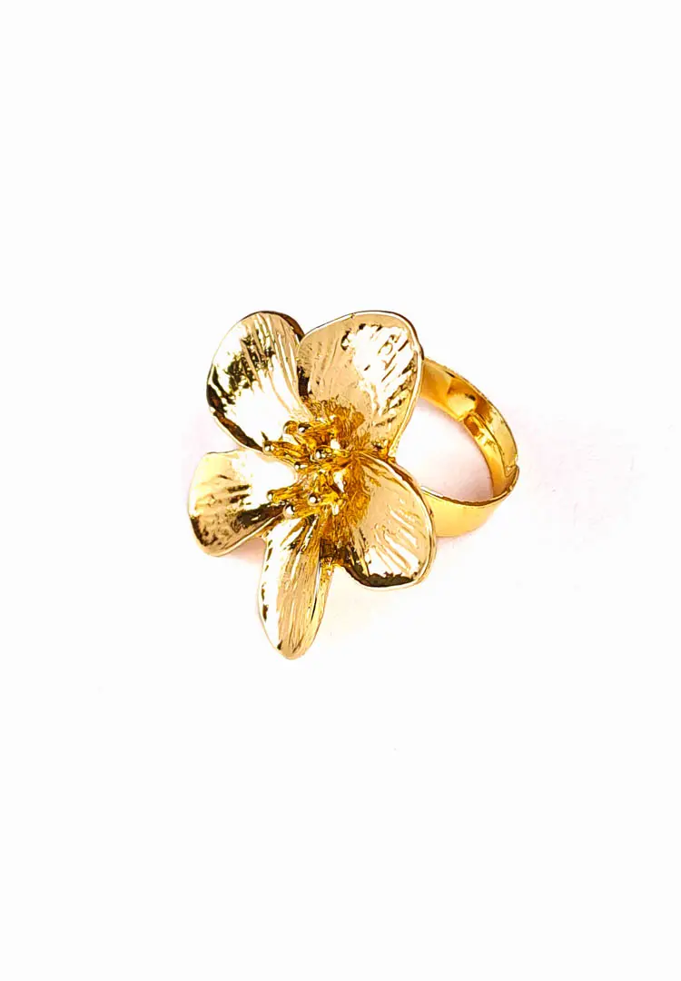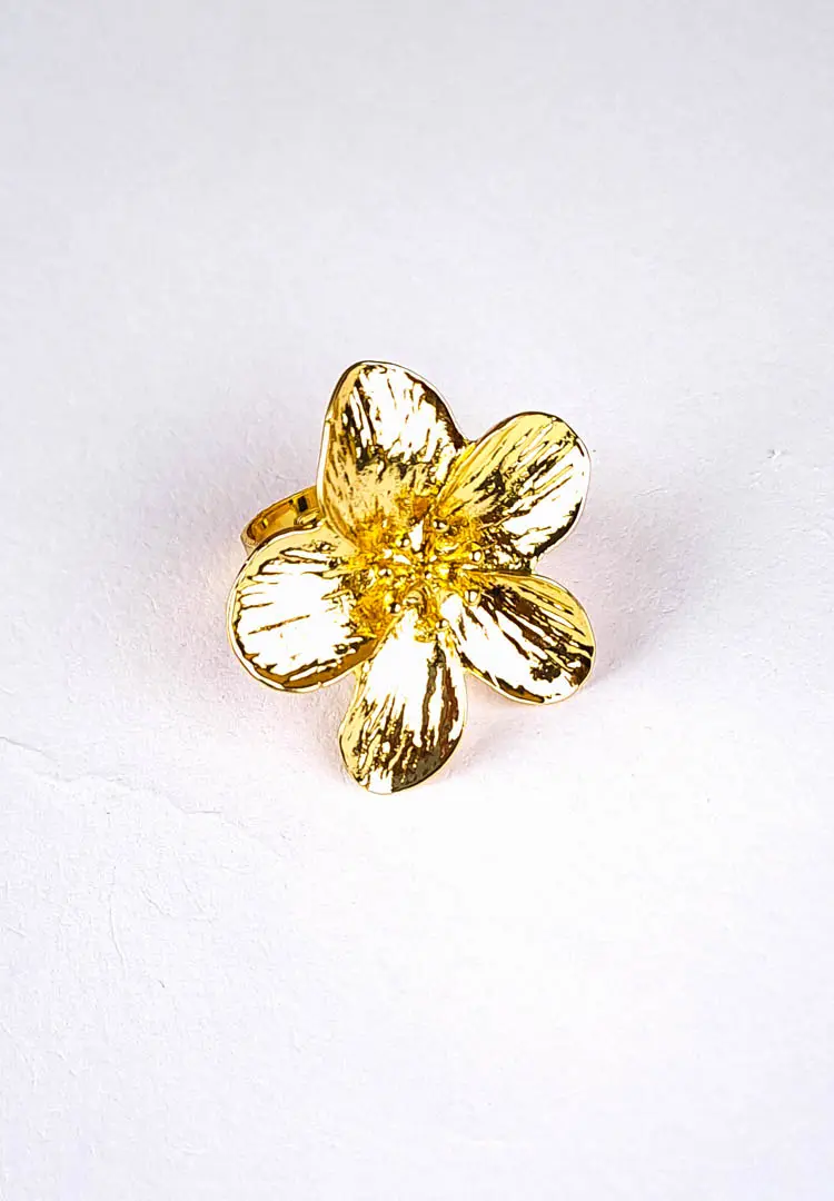 Bold statement ring featuring a textured flower design crafted in polished gold-tone metal with detailed petals, adjustable band for a customizable fit.
