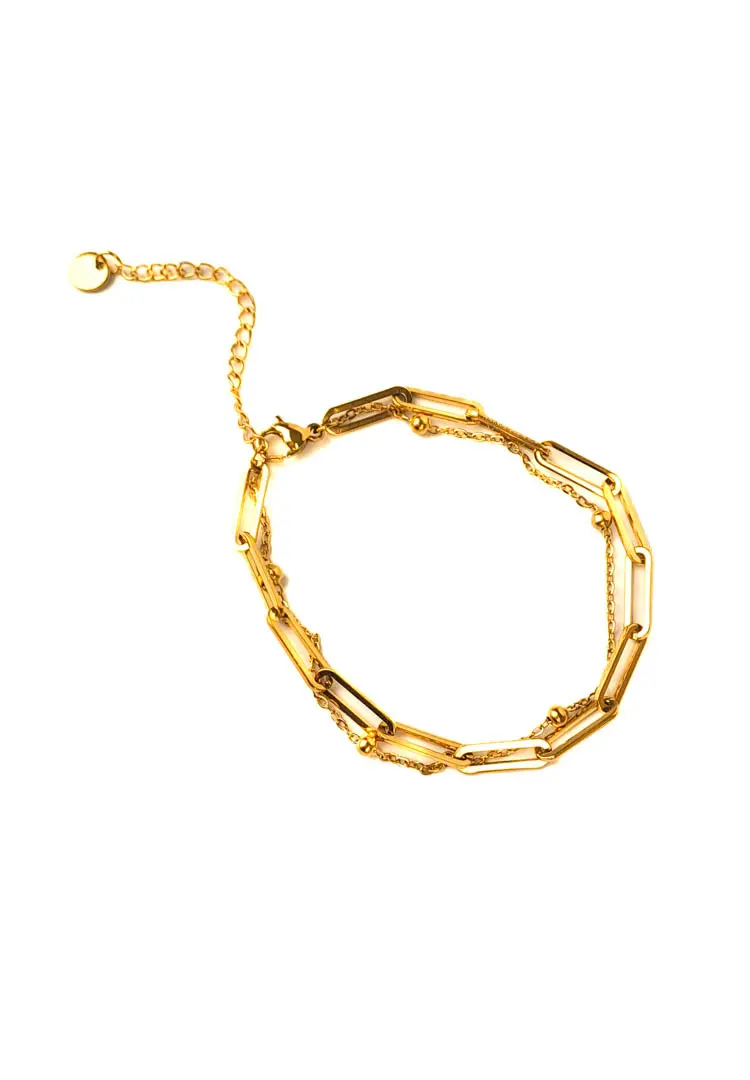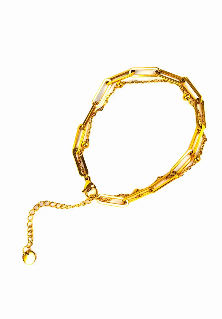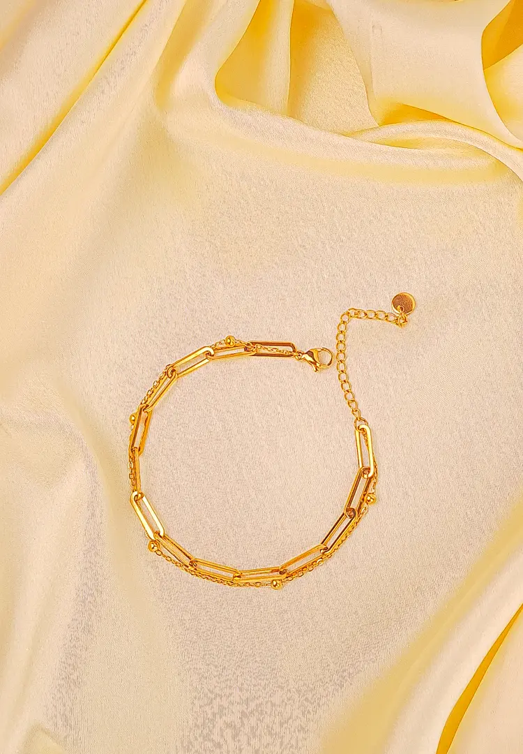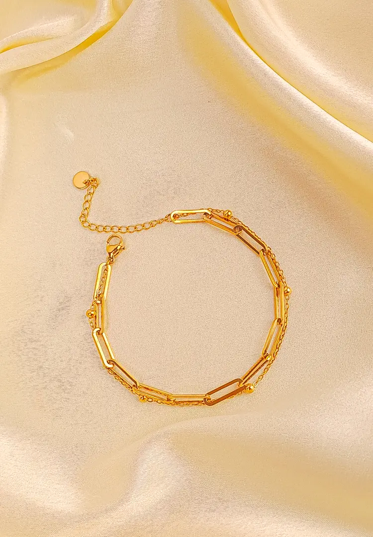 Layered gold bracelet, featuring a modern paperclip link chain paired with a delicate beaded chain design locked by lobstar claw clasp. Lightweight yet durable, this dual chain gold bracelet for women adds a touch of elegance to both casual and formal outfits. Perfect for daily wear, gifting, or stacking with other accessories, it’s a versatile must-have for your jewelry collection.