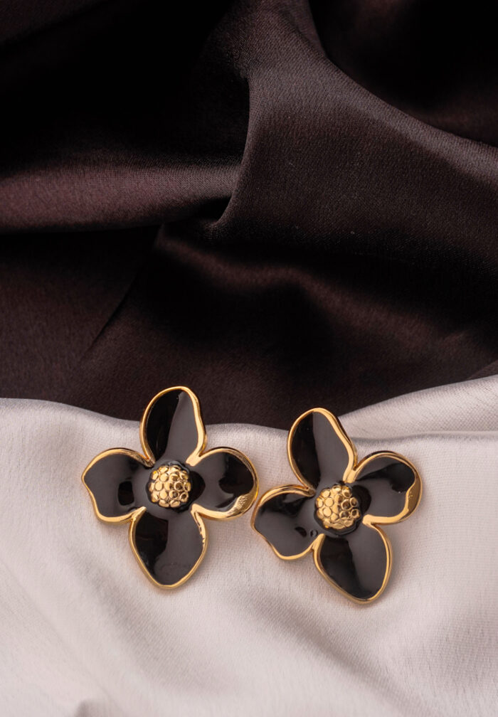 Flower shaped stud earring with a gold-tone finished having peach coloured acrylic inlay with a raised textured circular golden disc at the center and a push back post
