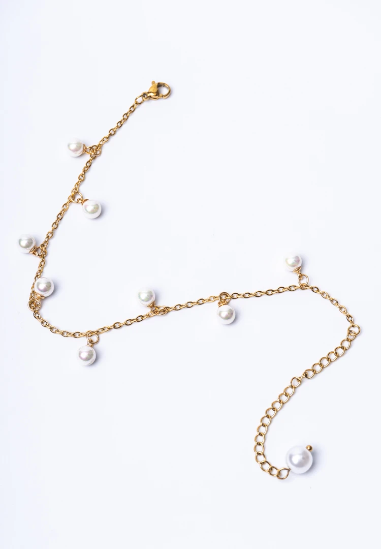 Curb chain bracelet with gold-tone finish featuring a series of dangling evenly spaced pearls with a lobster claw clasp