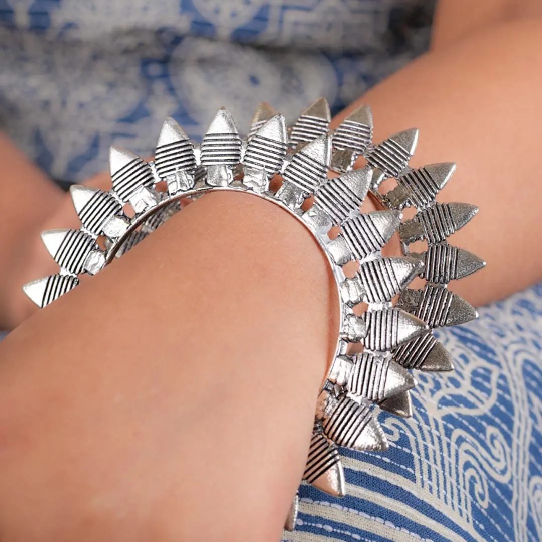 Set of bangles with fine line detailing and oxidised silver tone finish featuring a series of triangular shaped cone structured designs