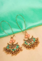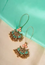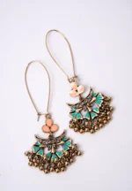 Geometric floral shaped dangle earring with oxidised gold-tone finish adorned with turquoise and peach coloured enamel inlay and a wire hook closure