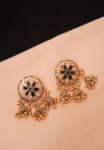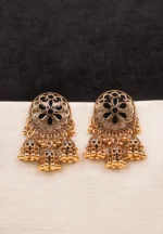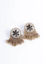 Floral structured metal dangle earring with oxidised gold-tone finish featuring intricate floral detailing with black coloured enamel inlay and detailed dome shaped designs at the bottom adorned with ghungroos and a push back closure