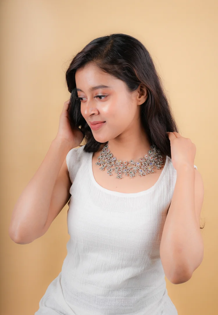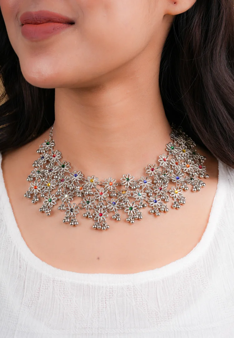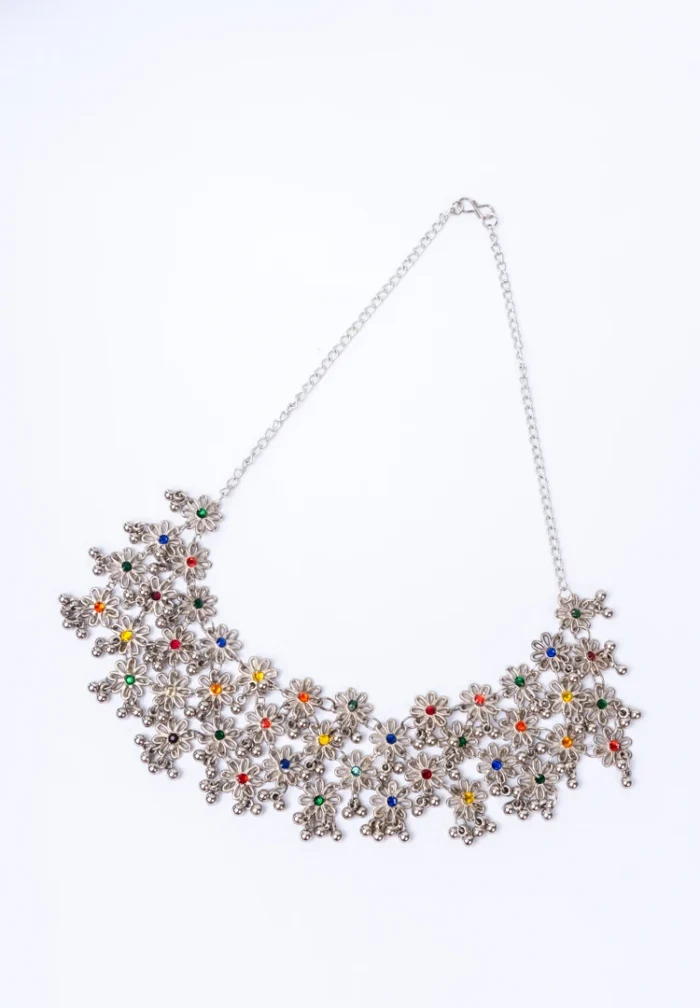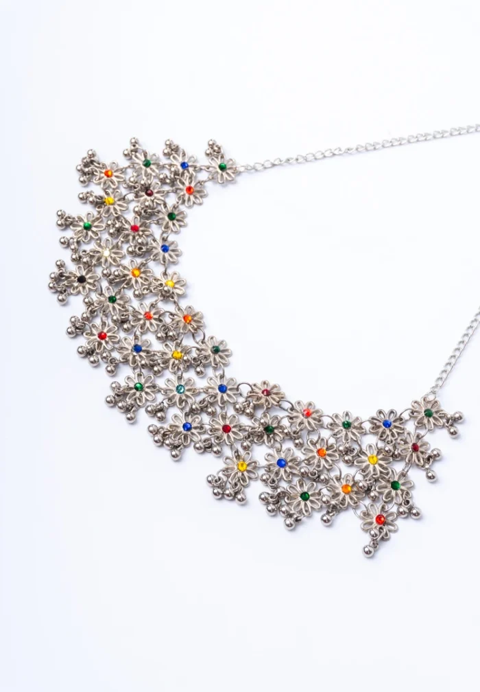 Metal curb chain necklace featuring a series of interconnected small flower shaped designs adorned with colourful gemstones and ghungroos and a s hook closure