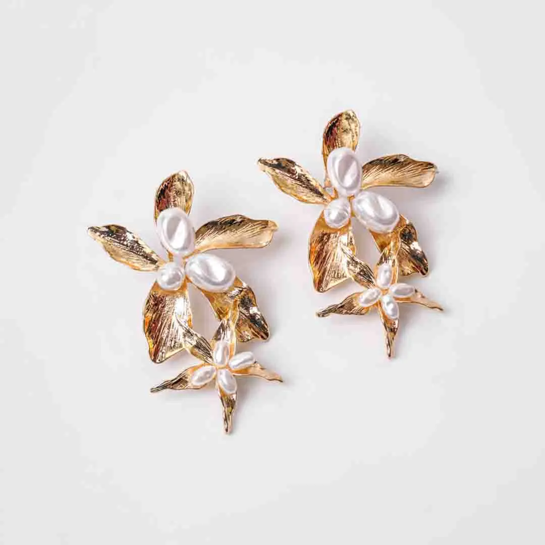 Metal drop earring featuring two textured flower shaped structure adorned with several lustrous pearls and golden tone/pearl white finish with a push back post