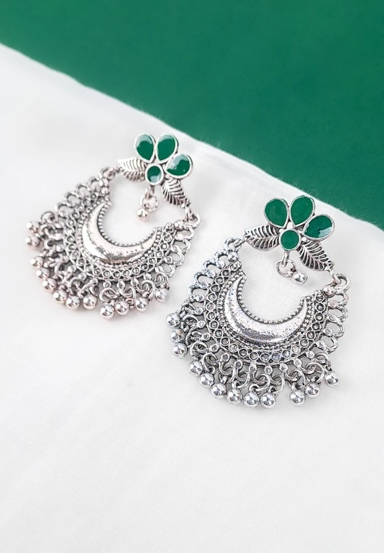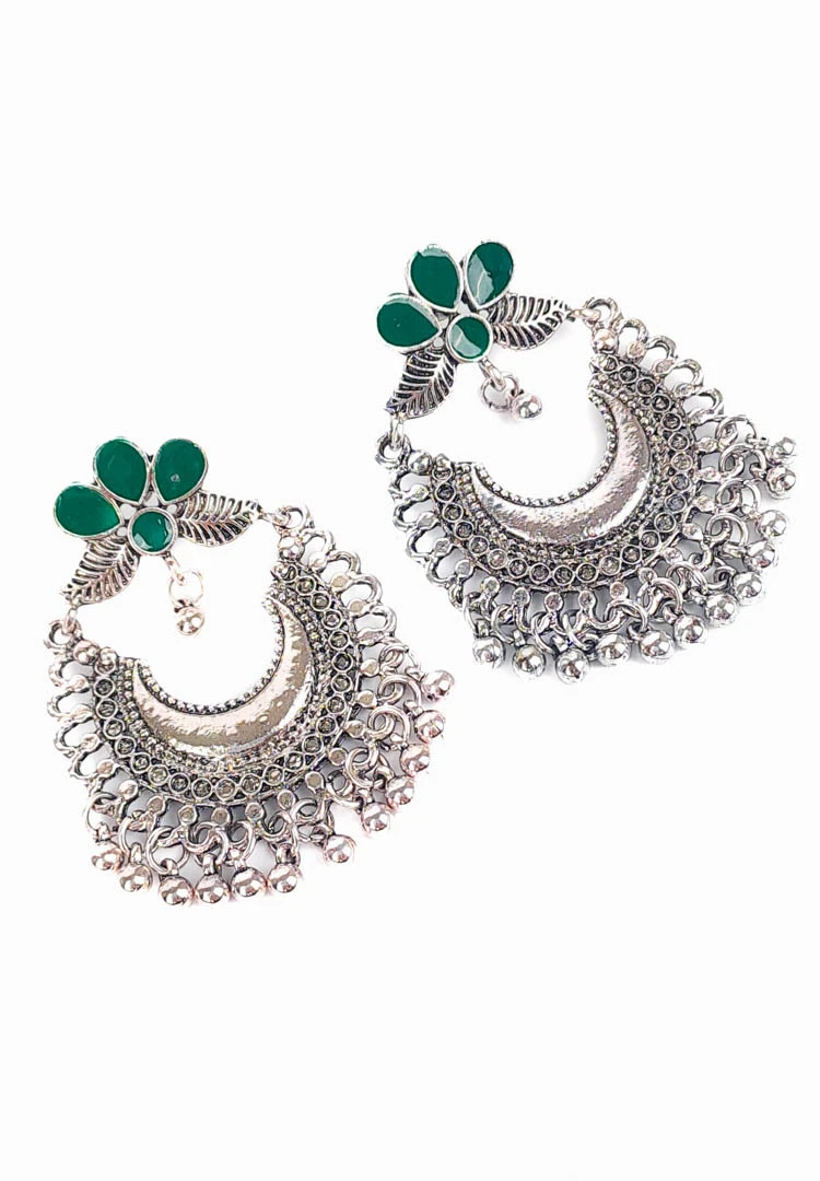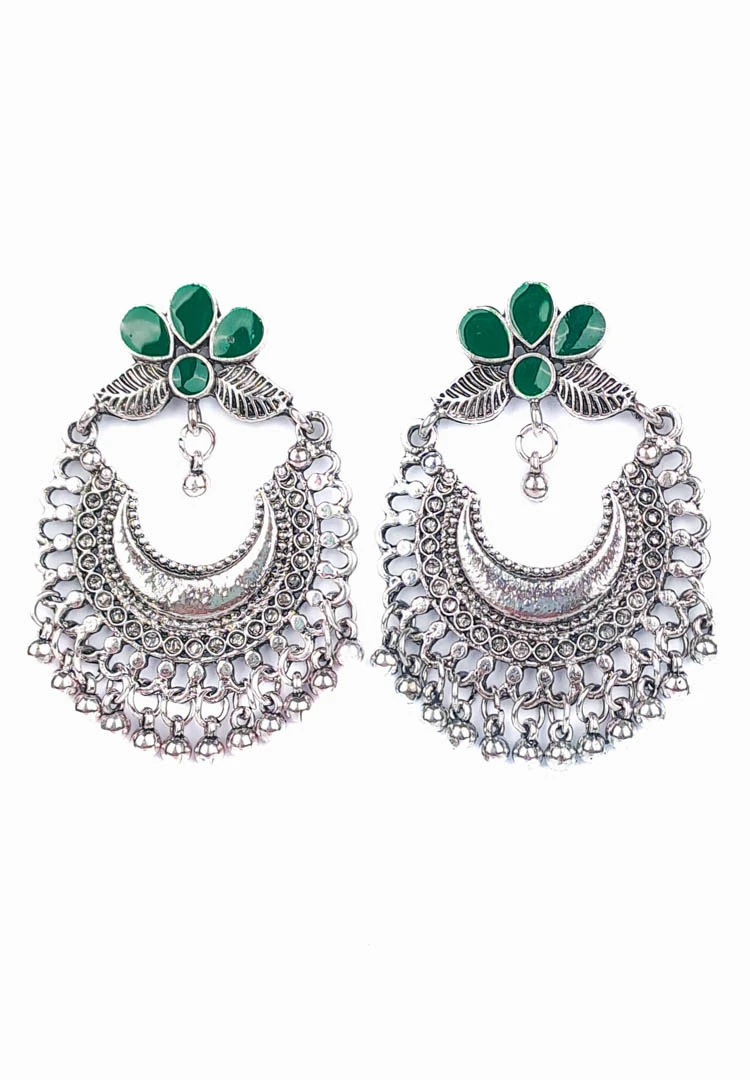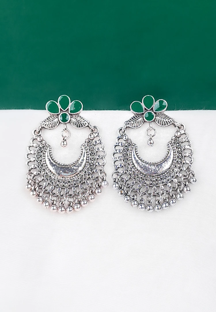 Step into traditional elegance with our stunning Floral Open Filigree Chandbali earrings. This magnificent drop earring begins with an ornate floral stud that is richly embellished with clear stones, securely setting the stage for the dramatic crescent below. The main body is a large Chandbali (half-moon) structure featuring open filigree metalwork—delicate swirls and geometric cutouts—that give the piece an airy lightness despite its size. This open design is beautifully accented with scattered clear stones and finished in a rich, antique gold-tone, creating a gorgeous heirloom effect. The entire earring is completed with a playful fringe of small metallic beads dangling from the base, adding movement and subtle shimmer. These drops are an absolute showstopper, perfect for weddings, festivals, or any occasion that calls for a touch of regal charm.