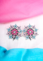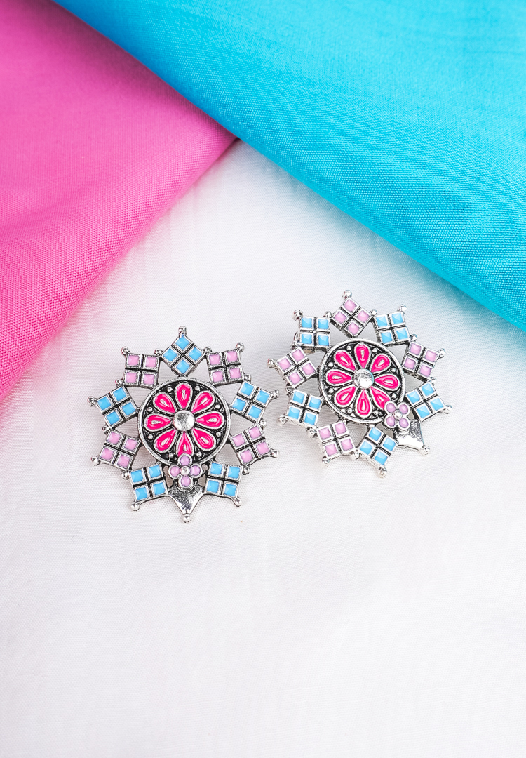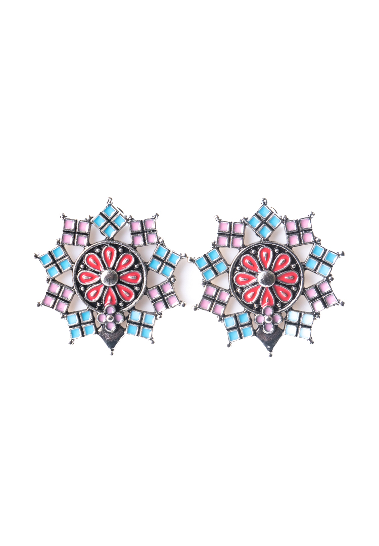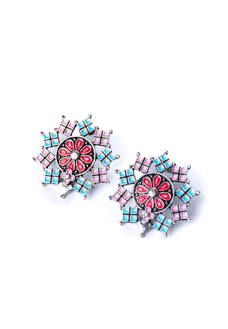 Floral structured metal stud earring with oxidised silver-tone finish featuring coloured geometric patterns adorned with a floral motif in the center and a push back closure