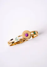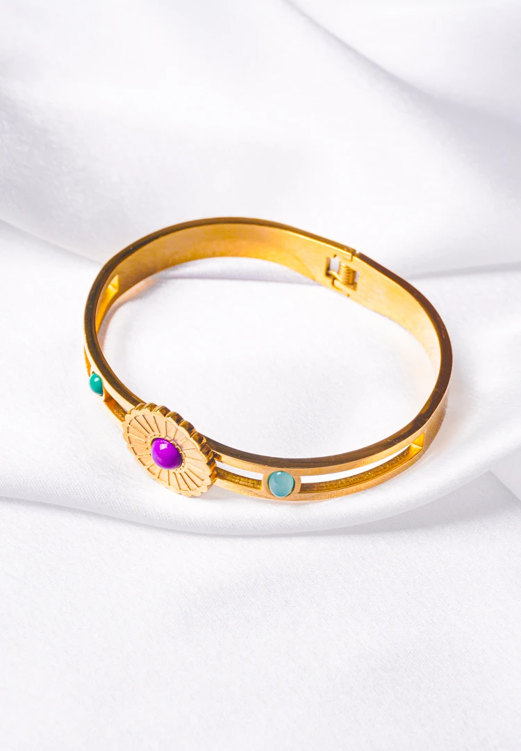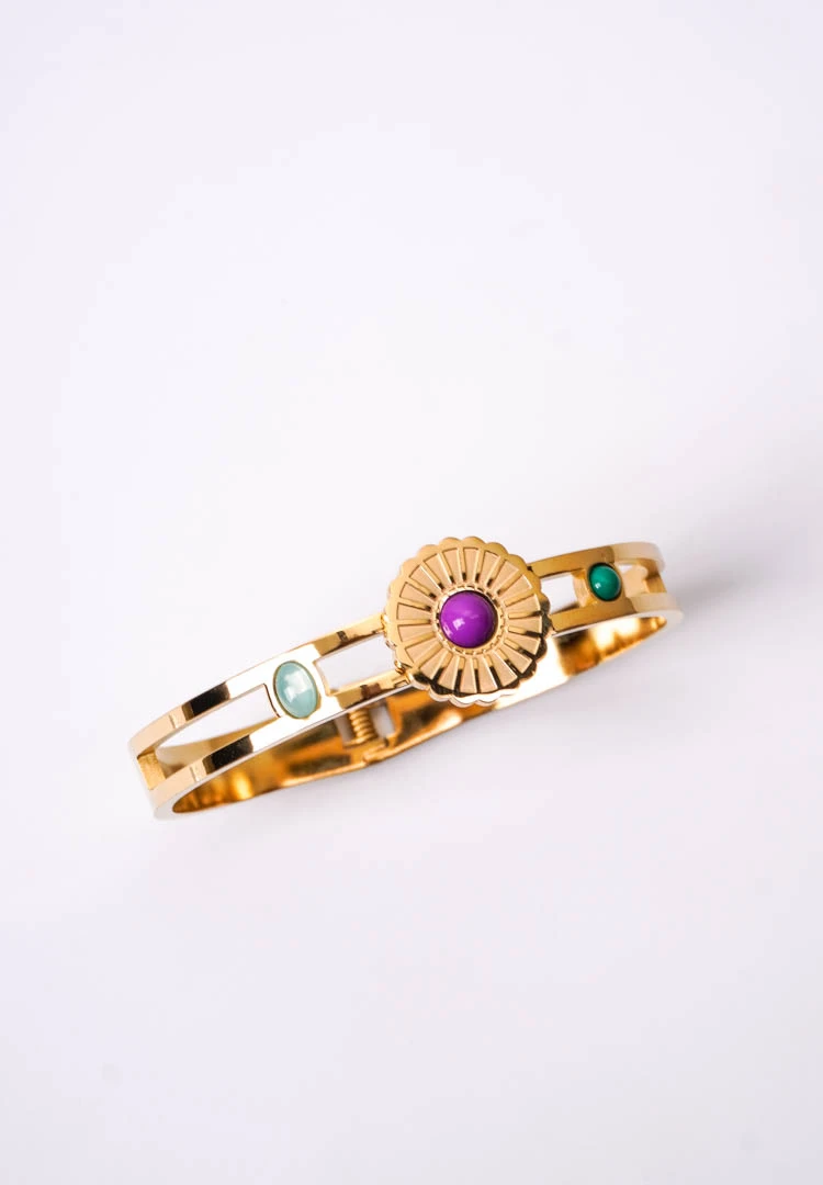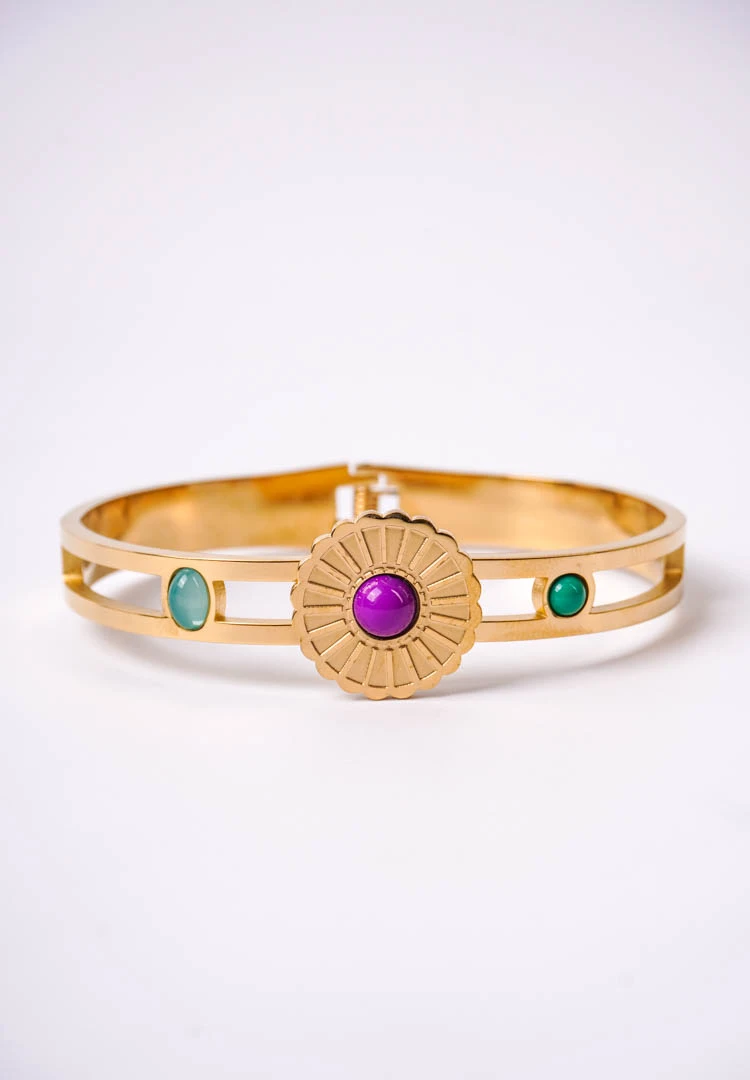 Hinged bracelet with golden tone/shamrock,purple,mint finish featuring a flower shaped design in the middle adorned with a purple gemstone and a green and teal blue coloured gemstone on the sides