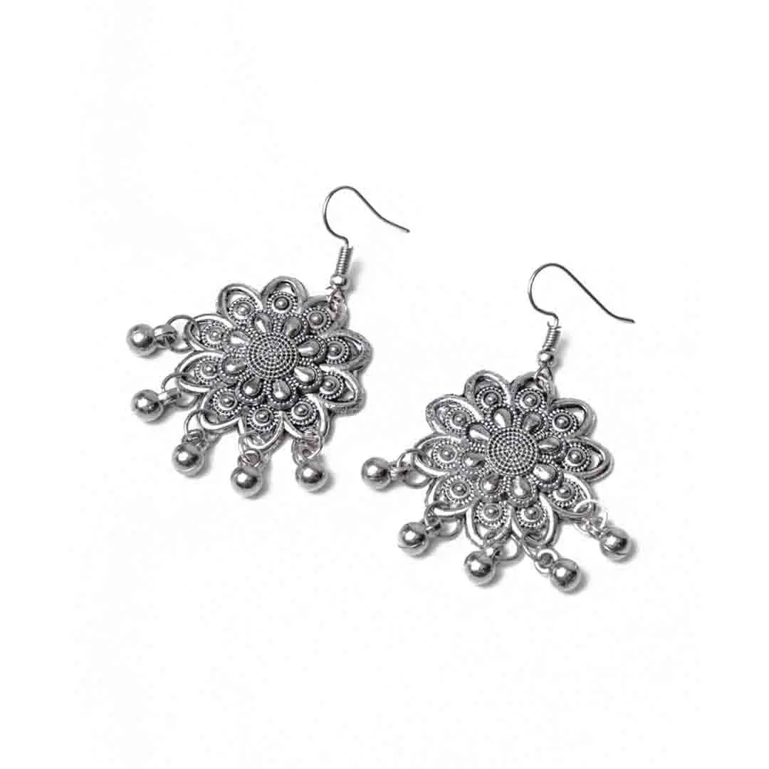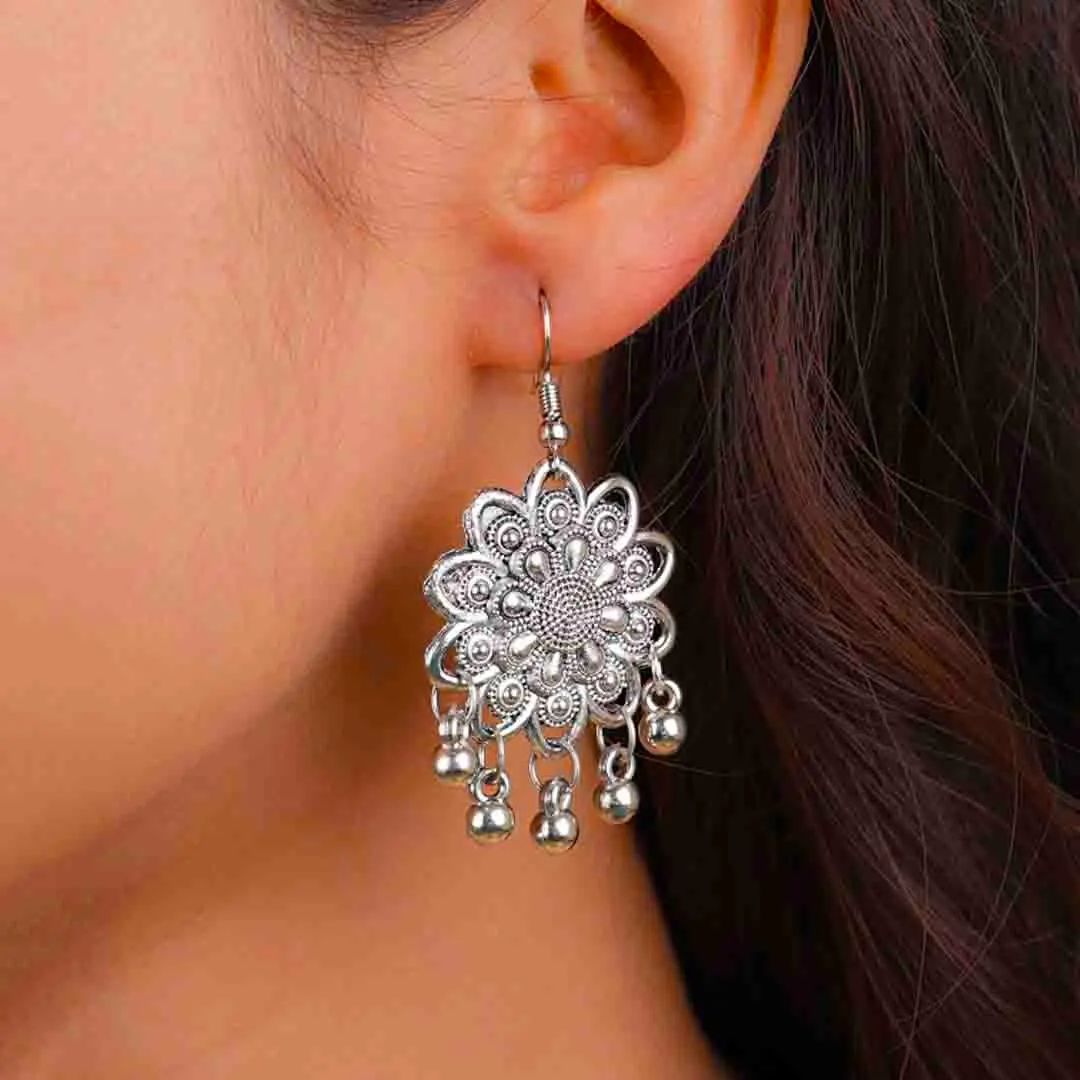 Flower shaped metal drop earring with fine intricate detailing and oxidised silver tone finish adorned with ghungroos at the bottom and a french hook closure