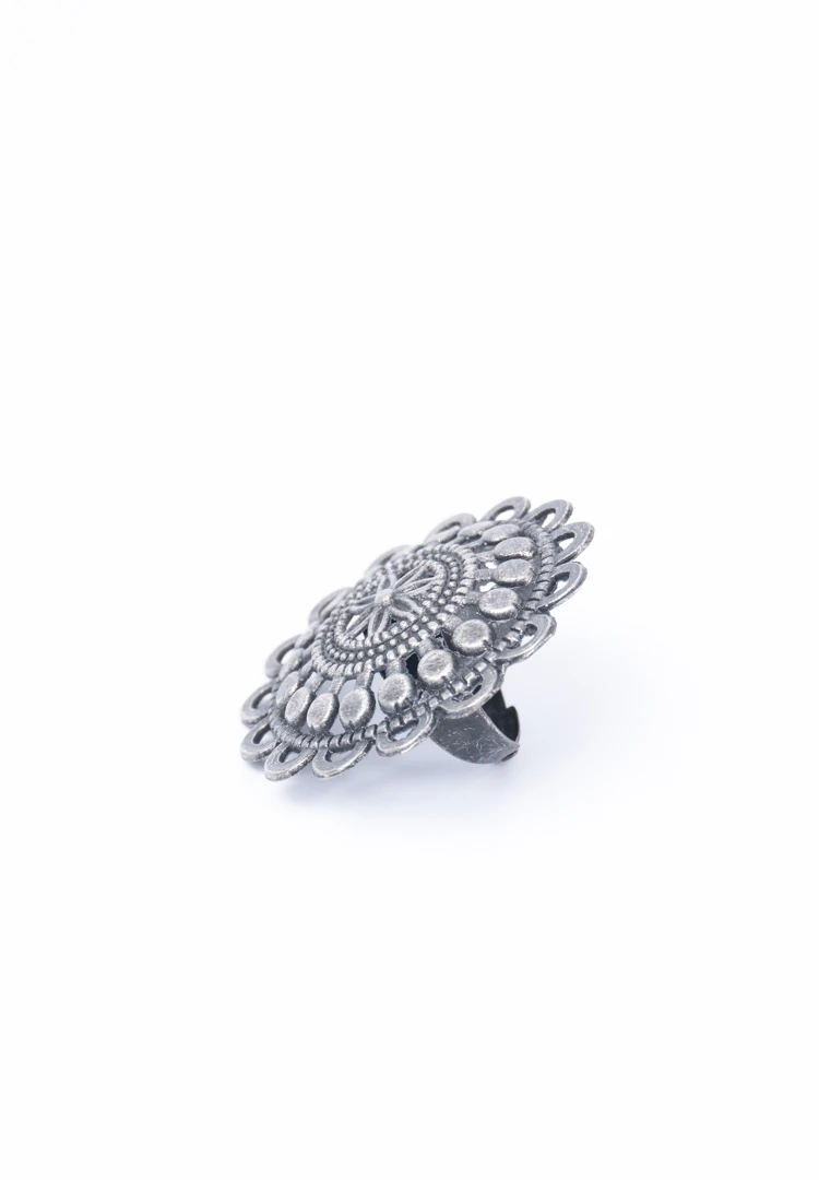 Large metal ring featuring fine intricate detailing and oxidised silver stone finish