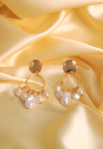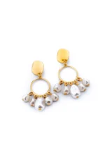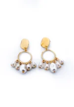 Metal dangle earring with a circular top and gold-tone finish featuring a golden hoop adorned with evenly spaced irregular shaped pearls and a push back closure