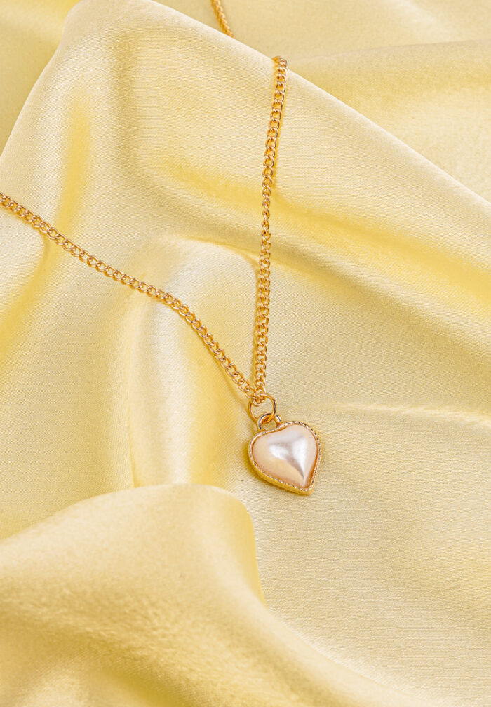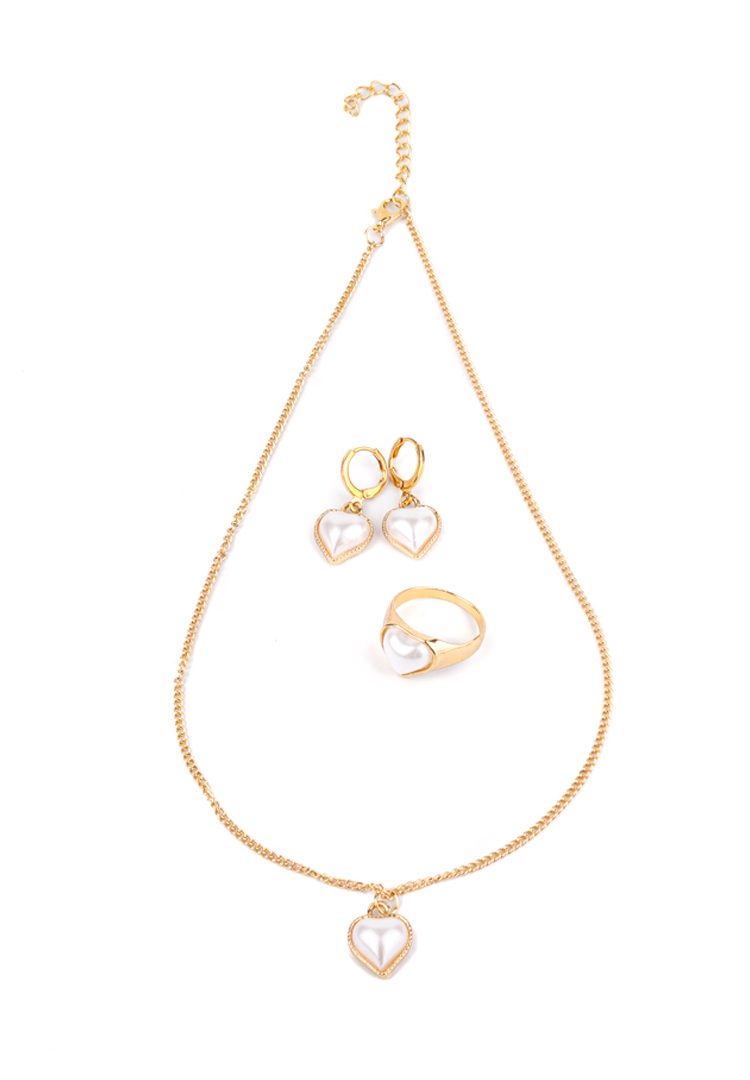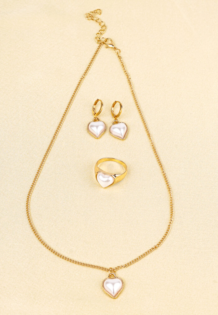 A Set of earring, ring and necklace features gold-toned heart shaped necklace, earrings and ring