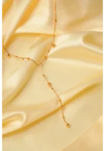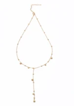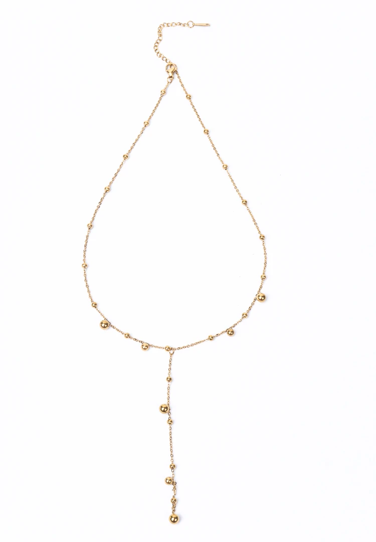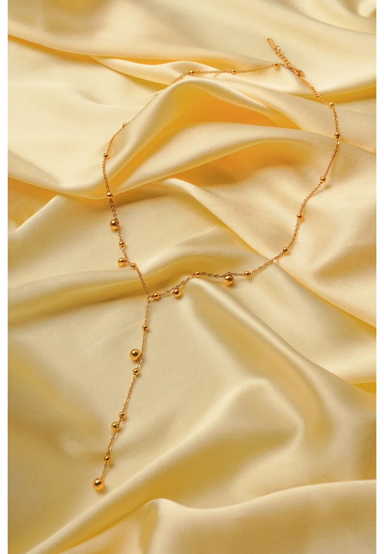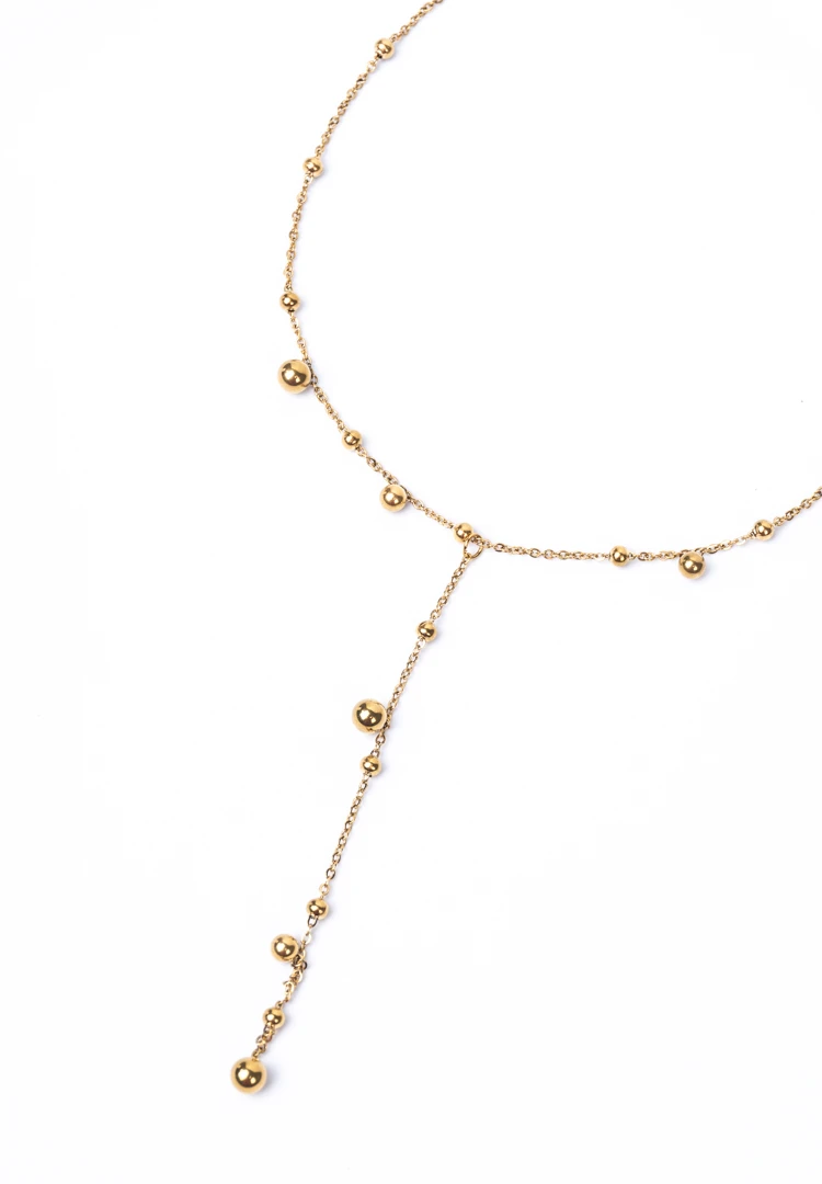 Metal satellite chain lariat necklace with polished gold-tone finish adorned with circular beads and a lobster claw clasp