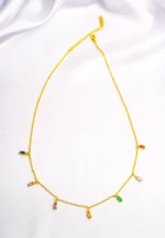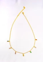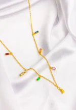 Delicate filled flat cable chain necklace with gold-tone finish featuring evenly spaced small dangling colourful rectangular shaped gemstones with a lobster claw clasp