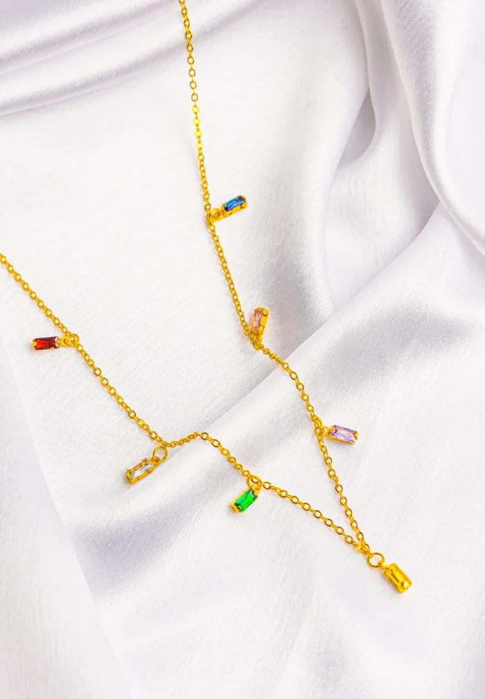 Delicate filled flat cable chain necklace with gold-tone finish featuring evenly spaced small dangling colourful rectangular shaped gemstones with a lobster claw clasp