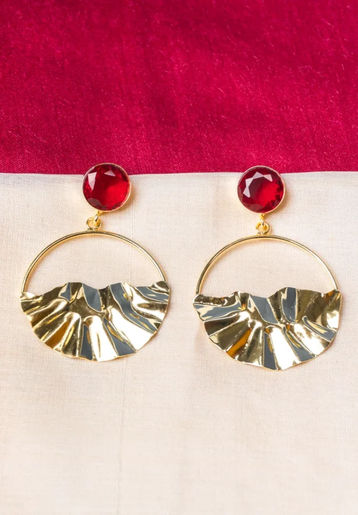 Metal hoop earring with polished golden tone/dark red finish featuring textured raffle design on the curve with large red coloured circular gemstone on top with push back closure