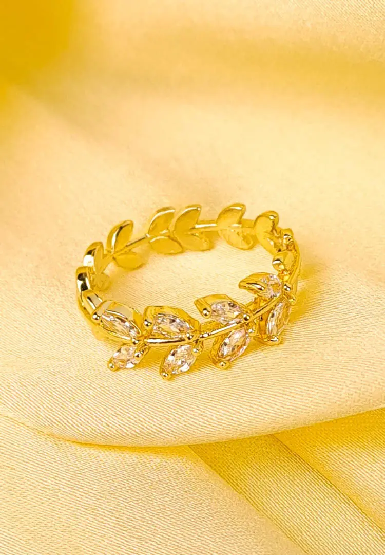 Open gold-tone adjustable ring featuring sculpted leaf motifs in a polished finish. Designed with a flexible band for easy fit, modern botanical style, and a bright, shiny texture.