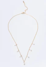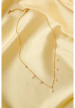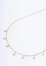 Delicate curb chain necklace with gold-tone finish featuring a series of dangling mini pearl beads and a lobster claw clasp