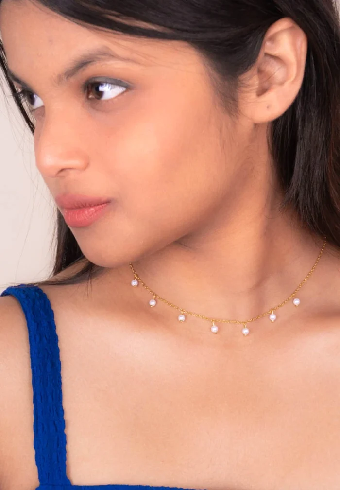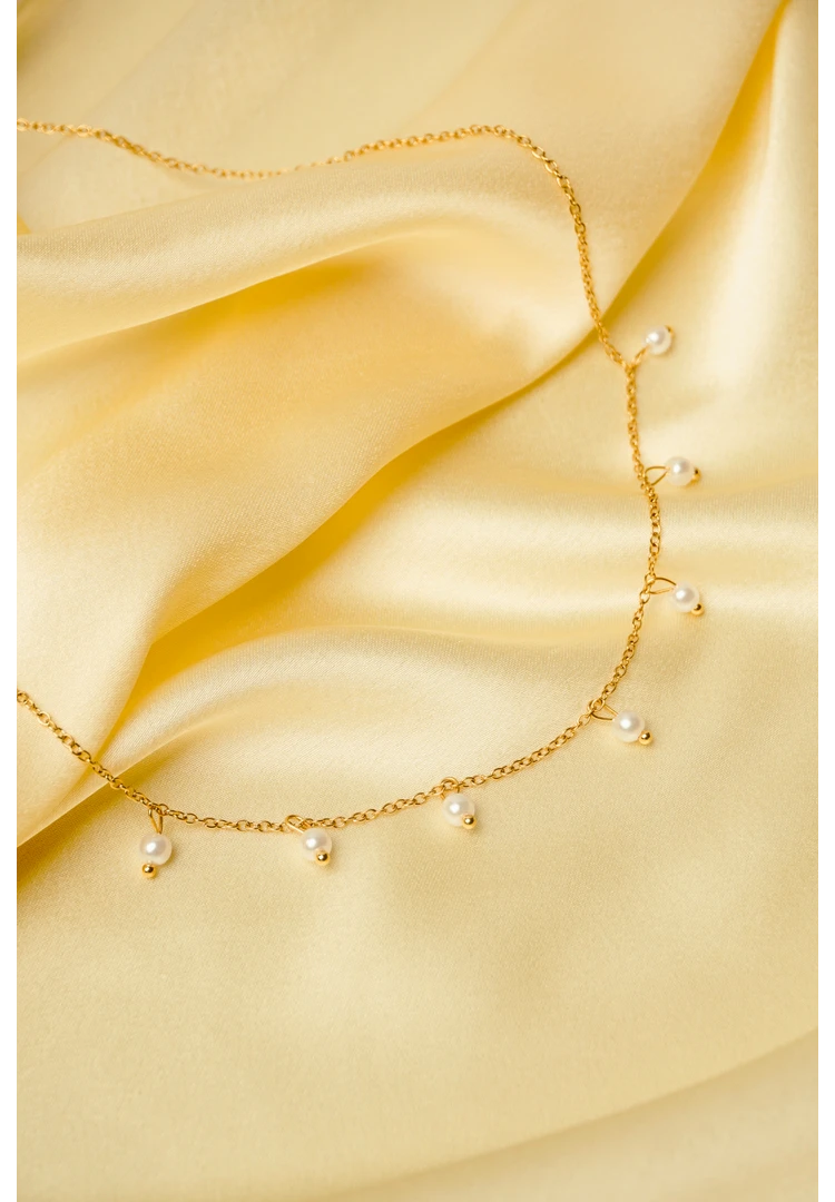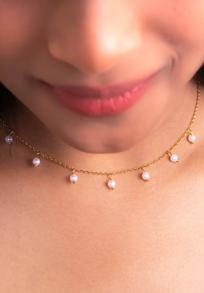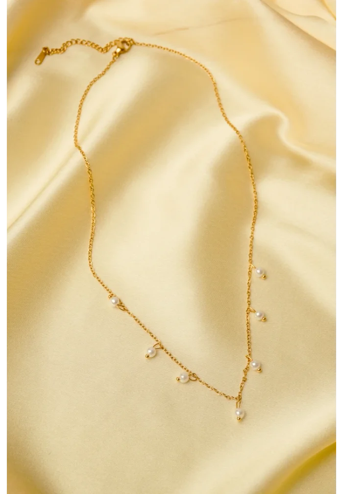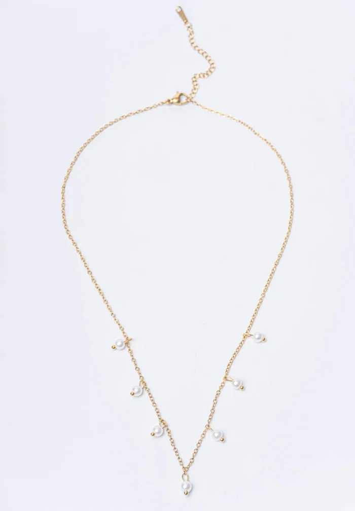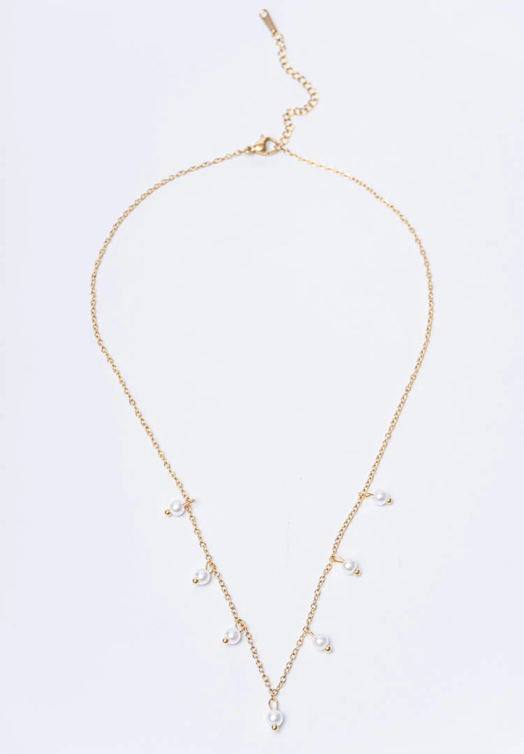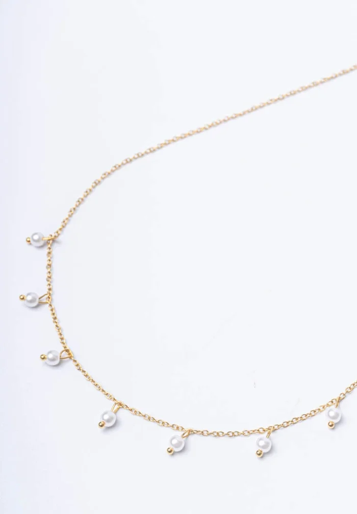 Delicate curb chain necklace with gold-tone finish featuring a series of dangling mini pearl beads and a lobster claw clasp