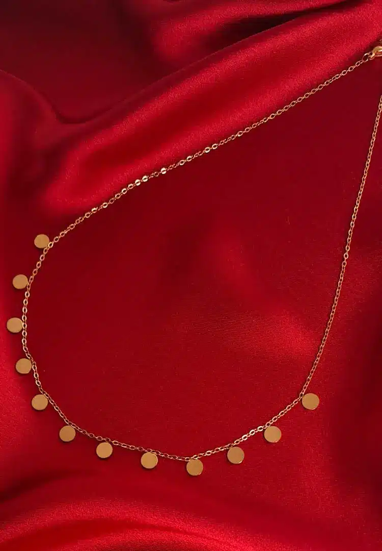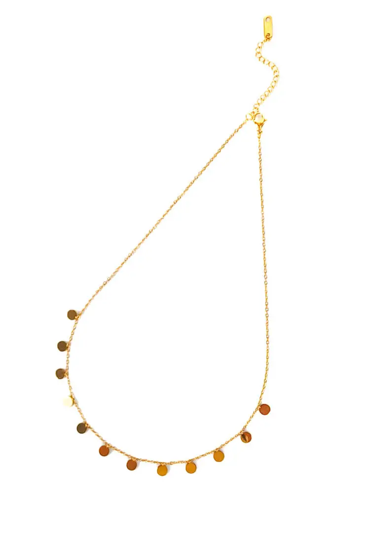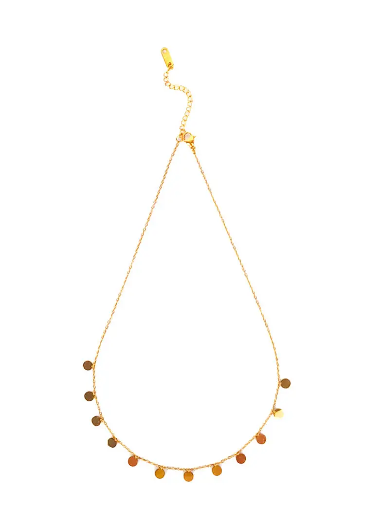 Dainty gold-tone chain necklace with polished round disc charms, creating a minimalist, playful drape. Crafted from stainless steel and finished with a glossy shine, it features an adjustable lobster clasp closure for versatile layering.