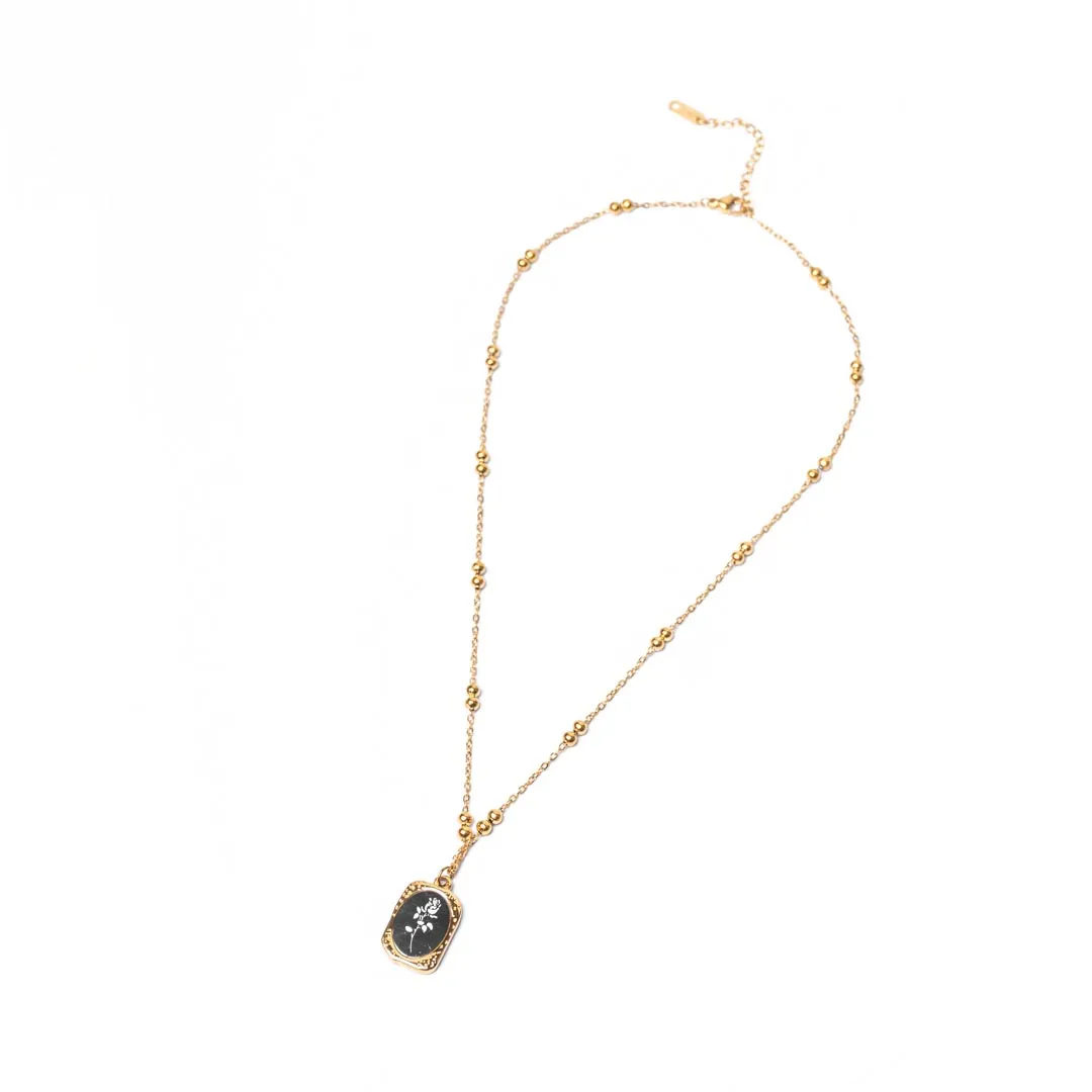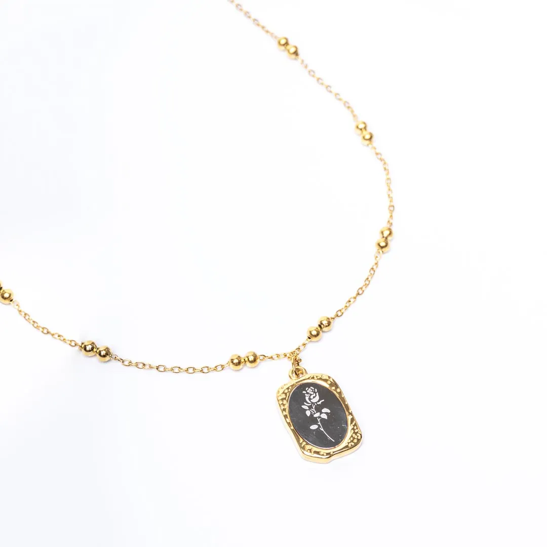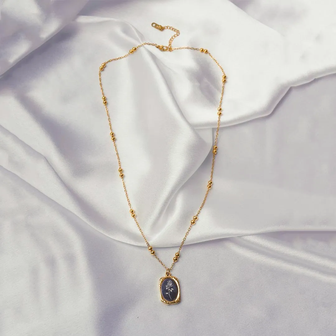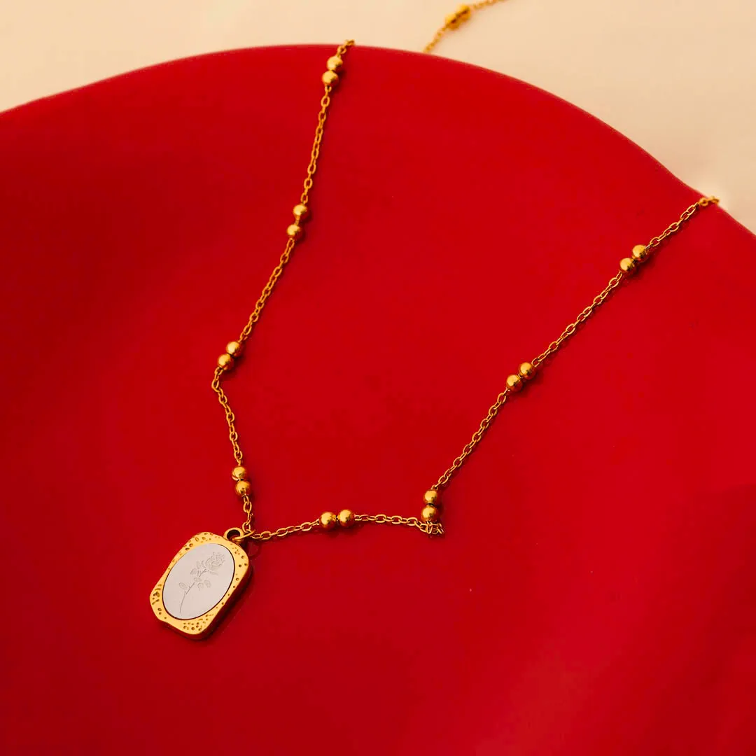 Golden Engraved Mirror Pendant Beaded Chain Necklace