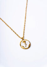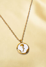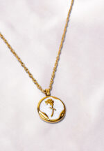 Delicate rope chain necklace with gold-tone finish featuring a circular pendant with glittery silver inlay and a rose design in the center with lobster claw clasp
