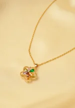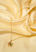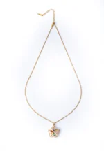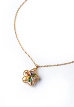 Delicate curb chain necklace with gold-tone finish featuring a flower shaped spinnable pendant adorned with several colourful gemstones and a lobster claw clasp