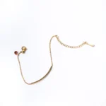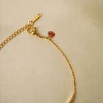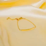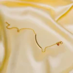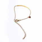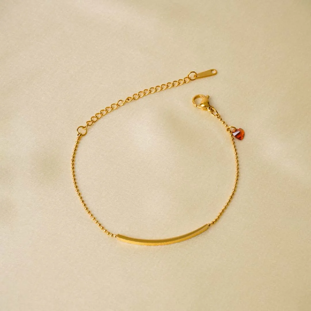 Delicate satellite chain bracelet with gold-tone finish featuring a slightly curved rectangular metallic bar in the center with a small orange coloured heart shaped charm and a lobster claw clasp