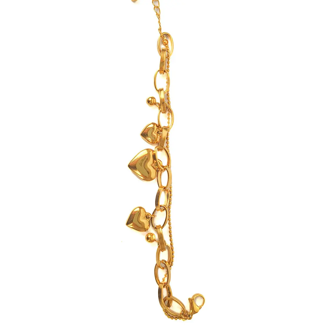 Bold gold-tone stainless steel chain bracelet with polished puffed heart charms and an adjustable lobster clasp. Glossy finish, modern link design, and playful, romantic appeal.