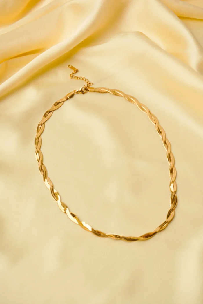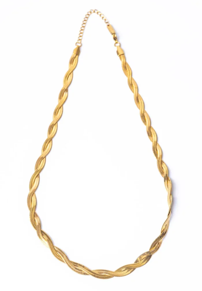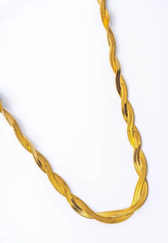 Twisted braided designed snake chain necklace with a polished gold-tone finish and lobster claw clasp