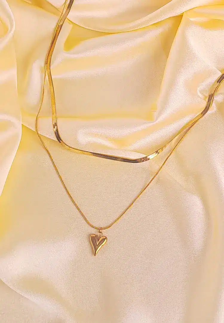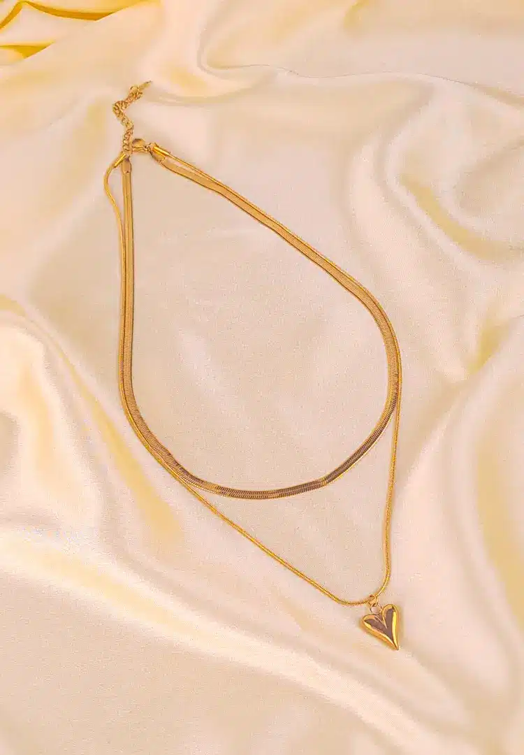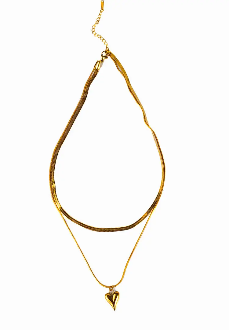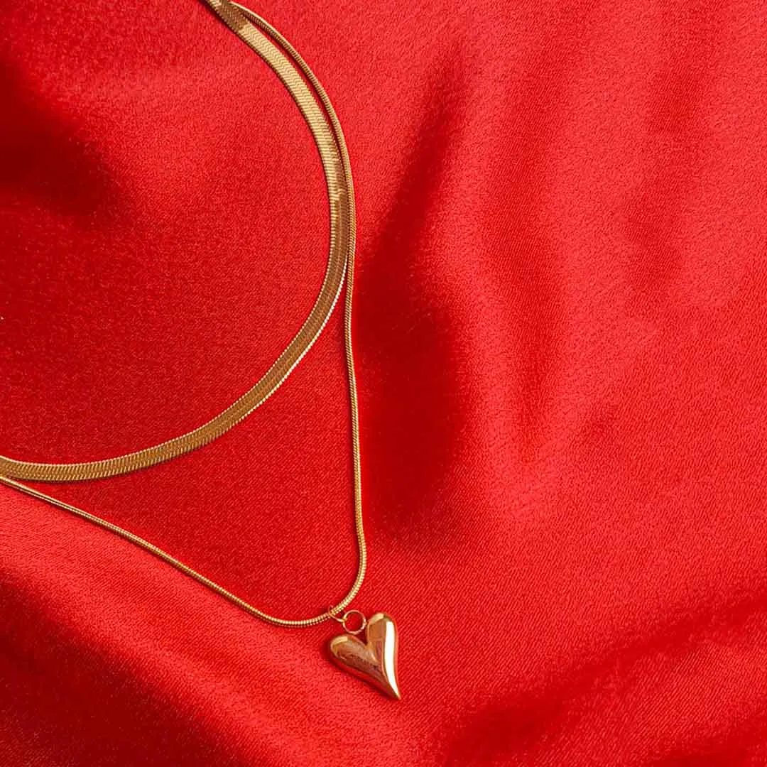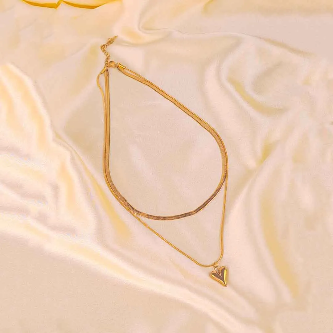 The Heart Herringbone Layered Necklace is a timeless piece featuring a sleek double-layered snake chain design. Finished in radiant gold, it carries a delicate heart pendant at the end, symbolizing love and elegance. The smooth herringbone layers sit beautifully on the neckline, perfect for both everyday wear and special occasions. Secured with a sturdy lobster claw clasp, this necklace blends style with comfort. A versatile accessory that adds a touch of charm to any outfit.