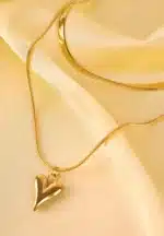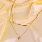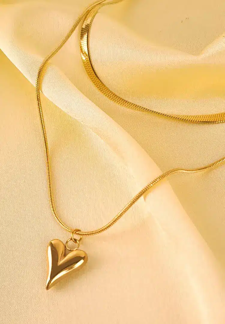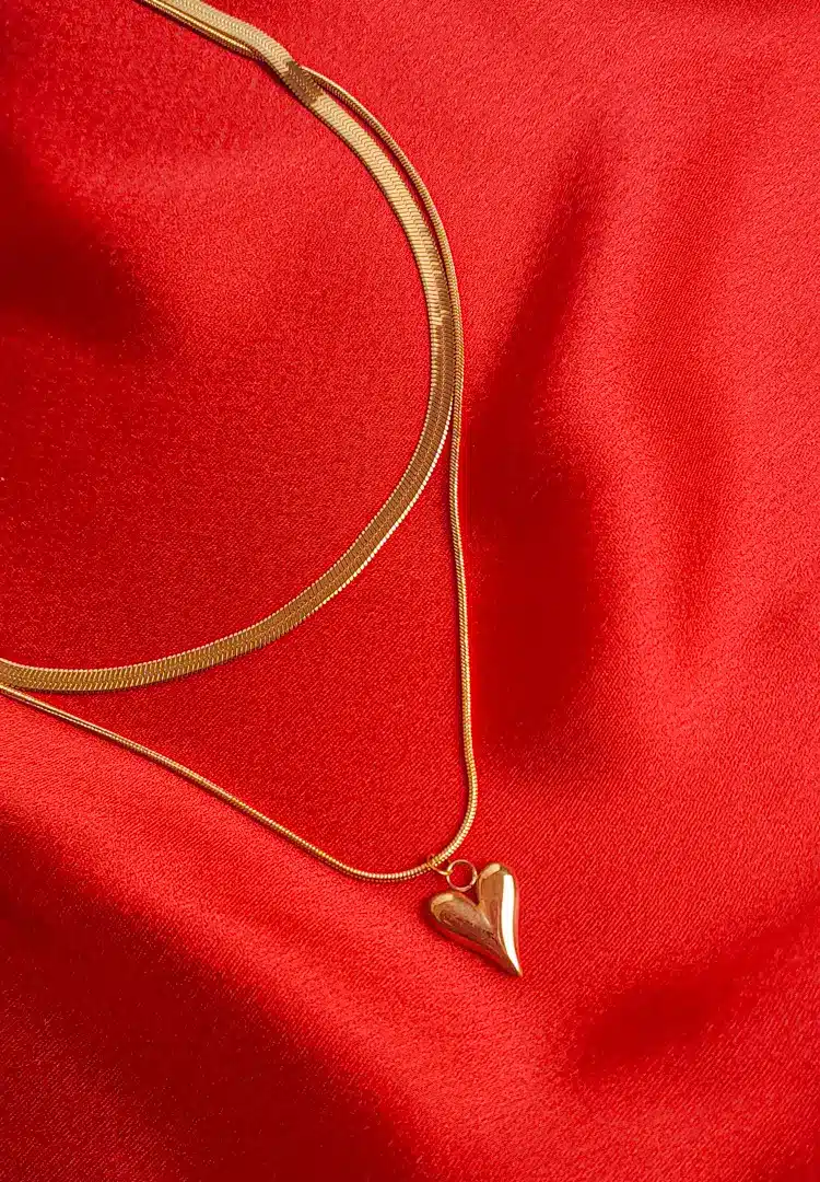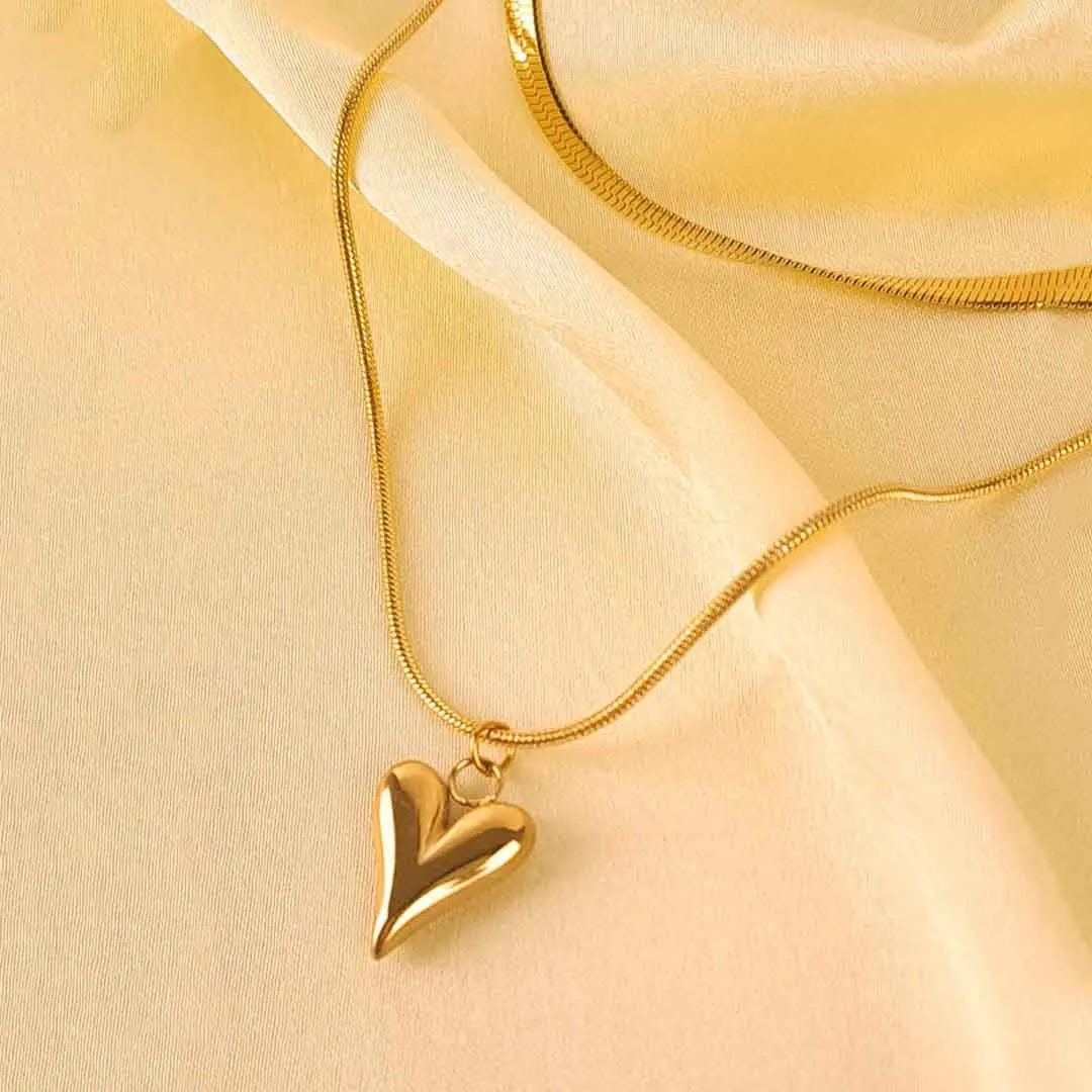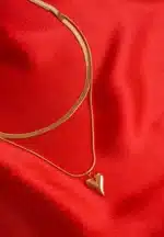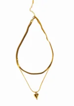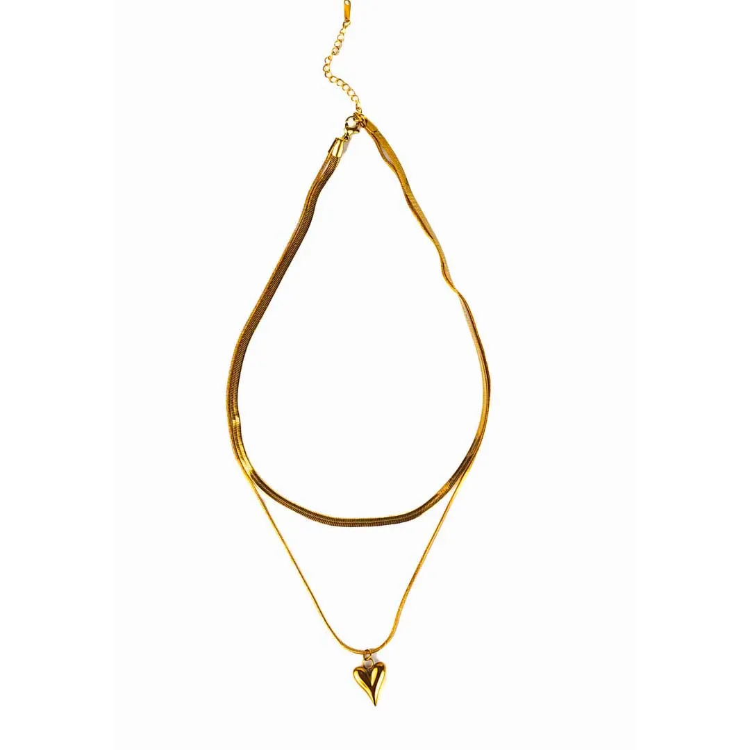 The Heart Herringbone Layered Necklace is a timeless piece featuring a sleek double-layered snake chain design. Finished in radiant gold, it carries a delicate heart pendant at the end, symbolizing love and elegance. The smooth herringbone layers sit beautifully on the neckline, perfect for both everyday wear and special occasions. Secured with a sturdy lobster claw clasp, this necklace blends style with comfort. A versatile accessory that adds a touch of charm to any outfit.