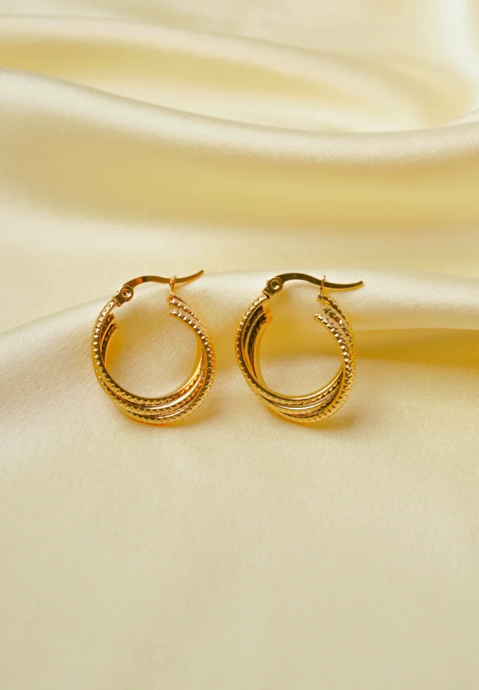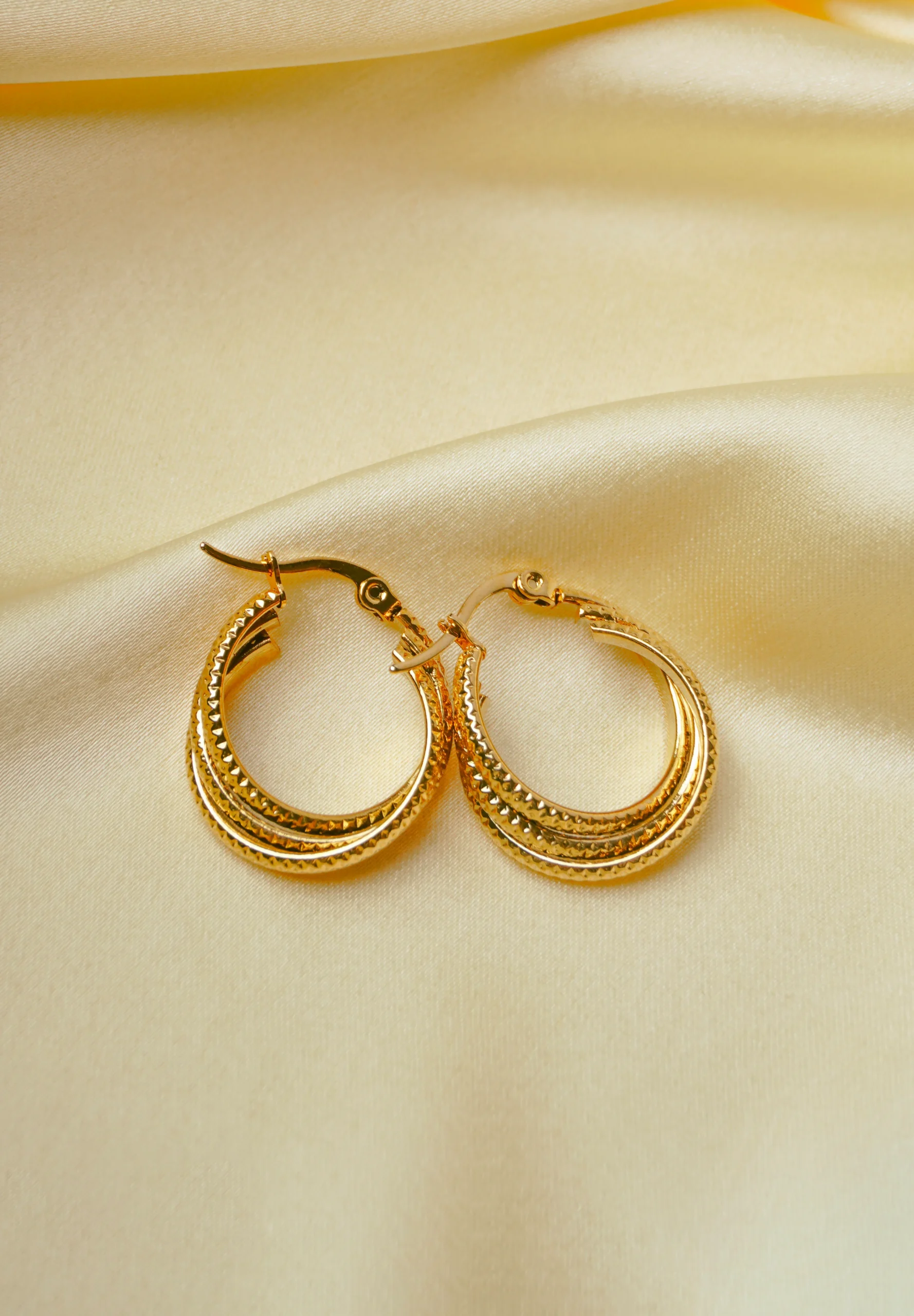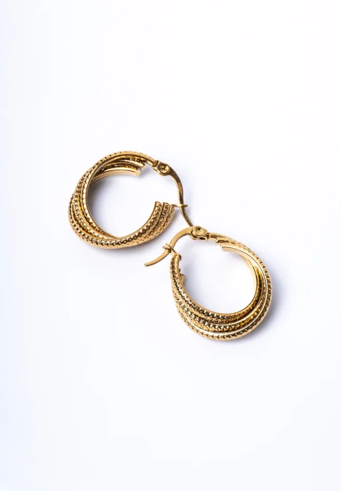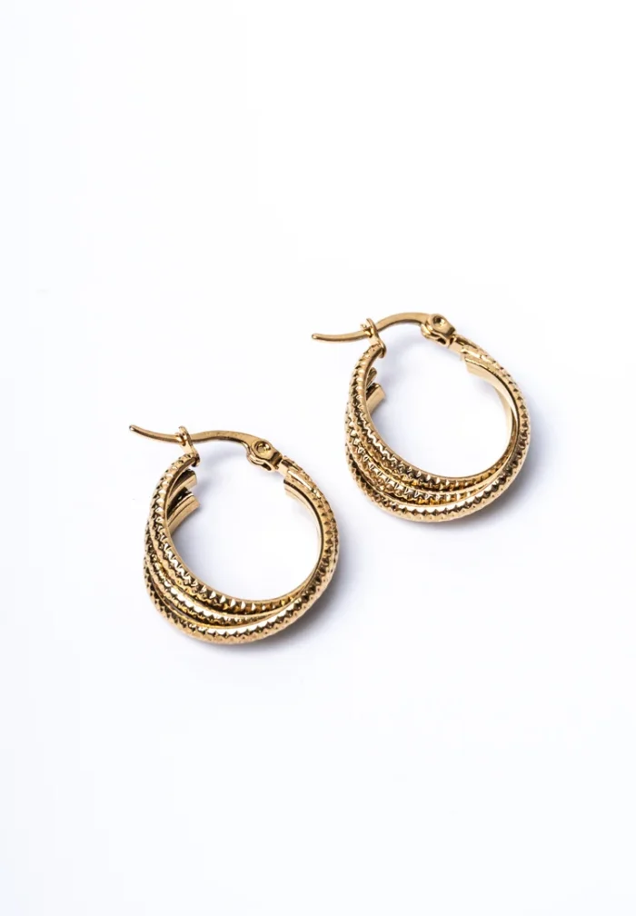 Textured three strand metal hoop earring with gold-toned finish featuring a intertwined design at the curve and a hinged back
