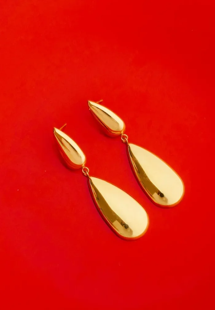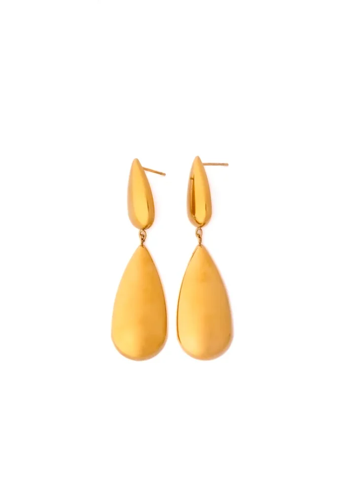 Two tier teardrop shaped dangle earring attached with a small loop with polished gold-tone finish and a push back closure