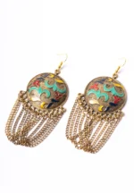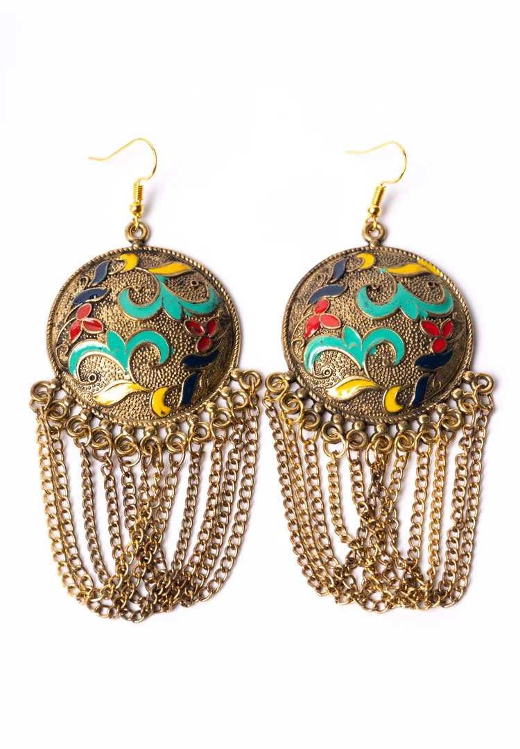 Circular designed metal dangle earring with textured intricate floral detailing and oxidised gold-tone finish adorned with interconnected chain tassels and a french hook closure