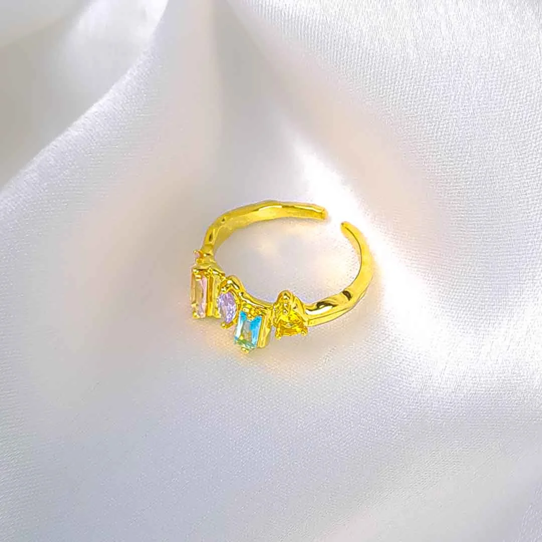 Chic gold-tone open ring featuring a series of pastel baguette crystals in prong settings, with an adjustable band for a custom fit. Each crystal adds a subtle rainbow touch, perfect for playful stacking and everyday style.