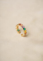 Adjustable ring with gold-tone finish adorned with a row of colourful square gemstones and intricate beaded edges