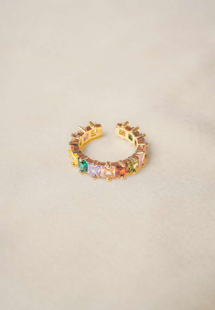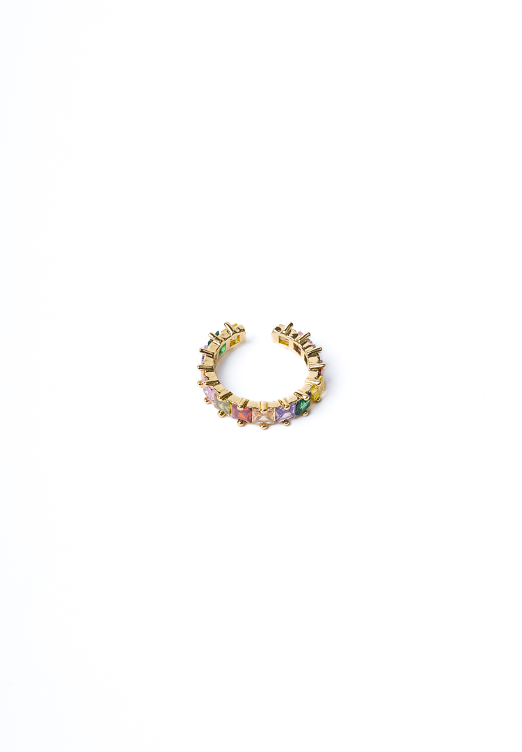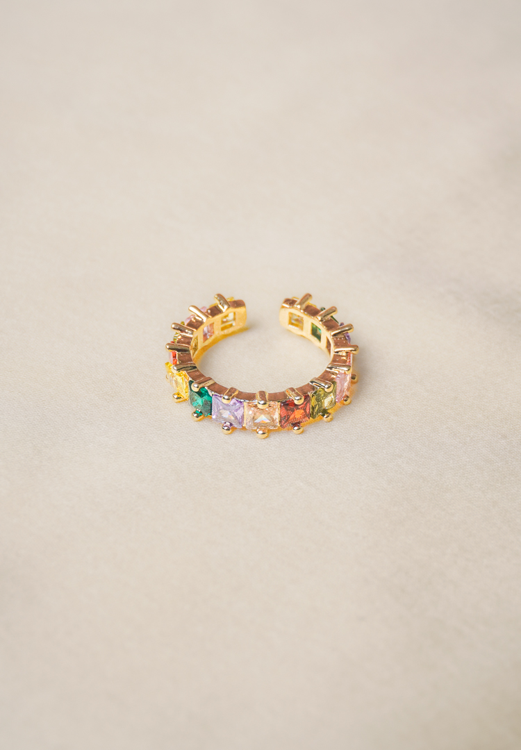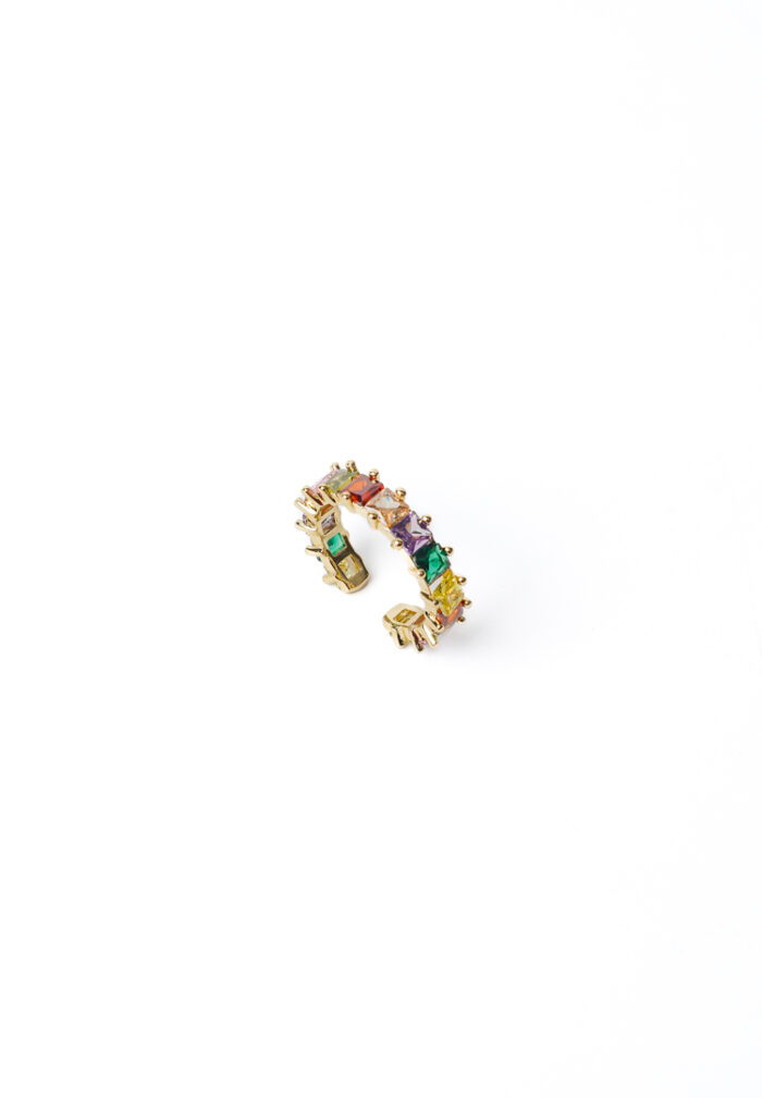 Adjustable ring with gold-tone finish adorned with a row of colourful square gemstones and intricate beaded edges