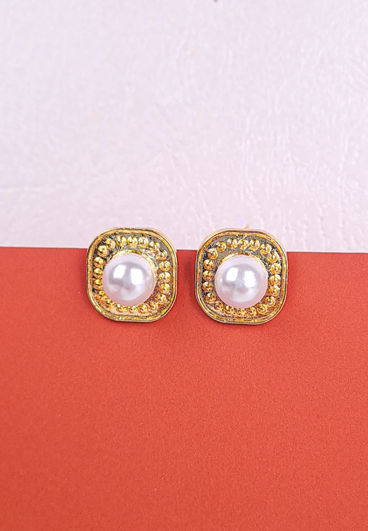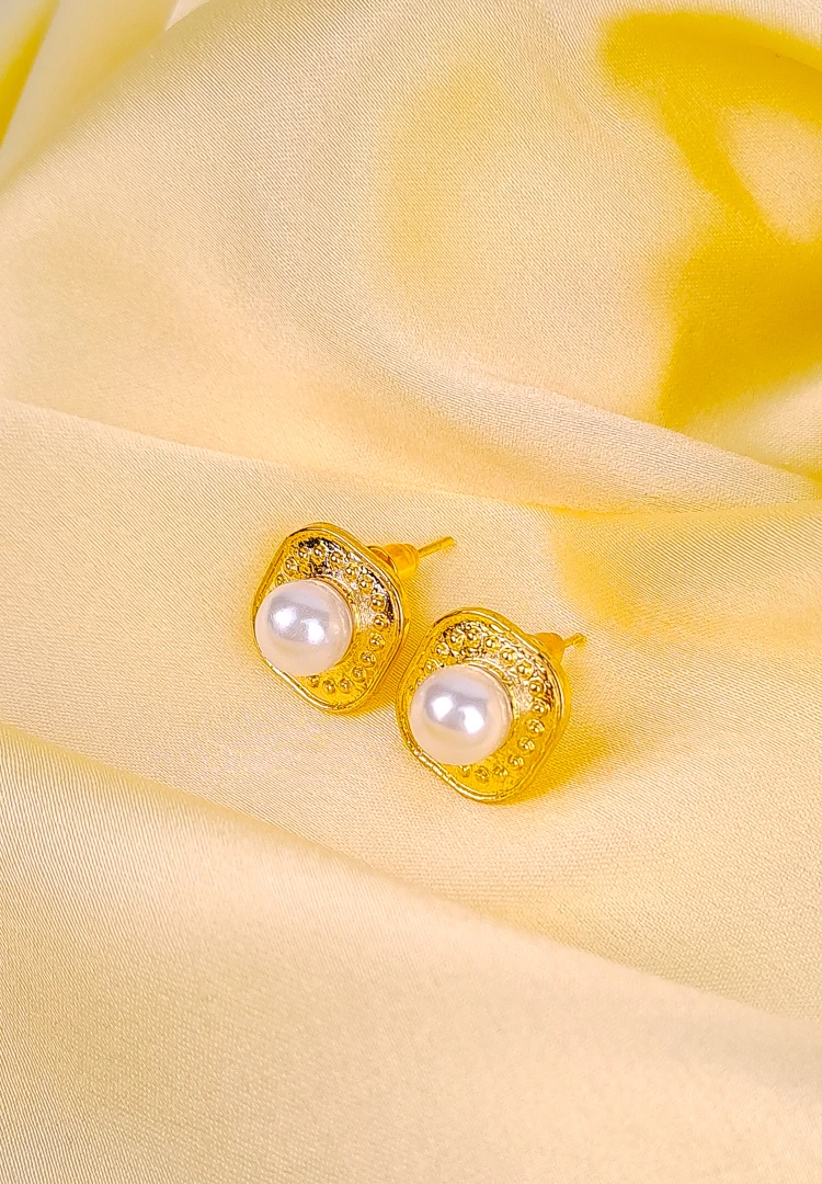 Classic stud earrings featuring luminous faux pearls set in a gold‑tone textured bezel with delicate dotted detailing. The compact rounded silhouette has a polished finish and secure push‑back posts.