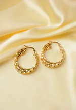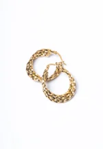 Twisted spiral three strand metal hoop earring with gold-toned finish featuring a distinctive twisted design formed at the curve and a hinged back