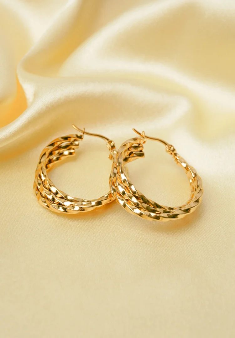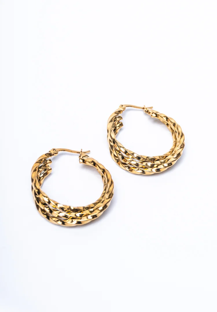 Twisted spiral three strand metal hoop earring with gold-toned finish featuring a distinctive twisted design formed at the curve and a hinged back