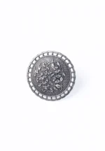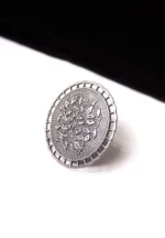 Large circular metal ring featuring fine intricate floral detailing adorned with leafy design in the centre and oxidised silver stone finish