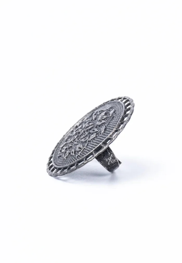 Large circular metal ring featuring fine intricate floral detailing adorned with leafy design in the centre and oxidised silver stone finish