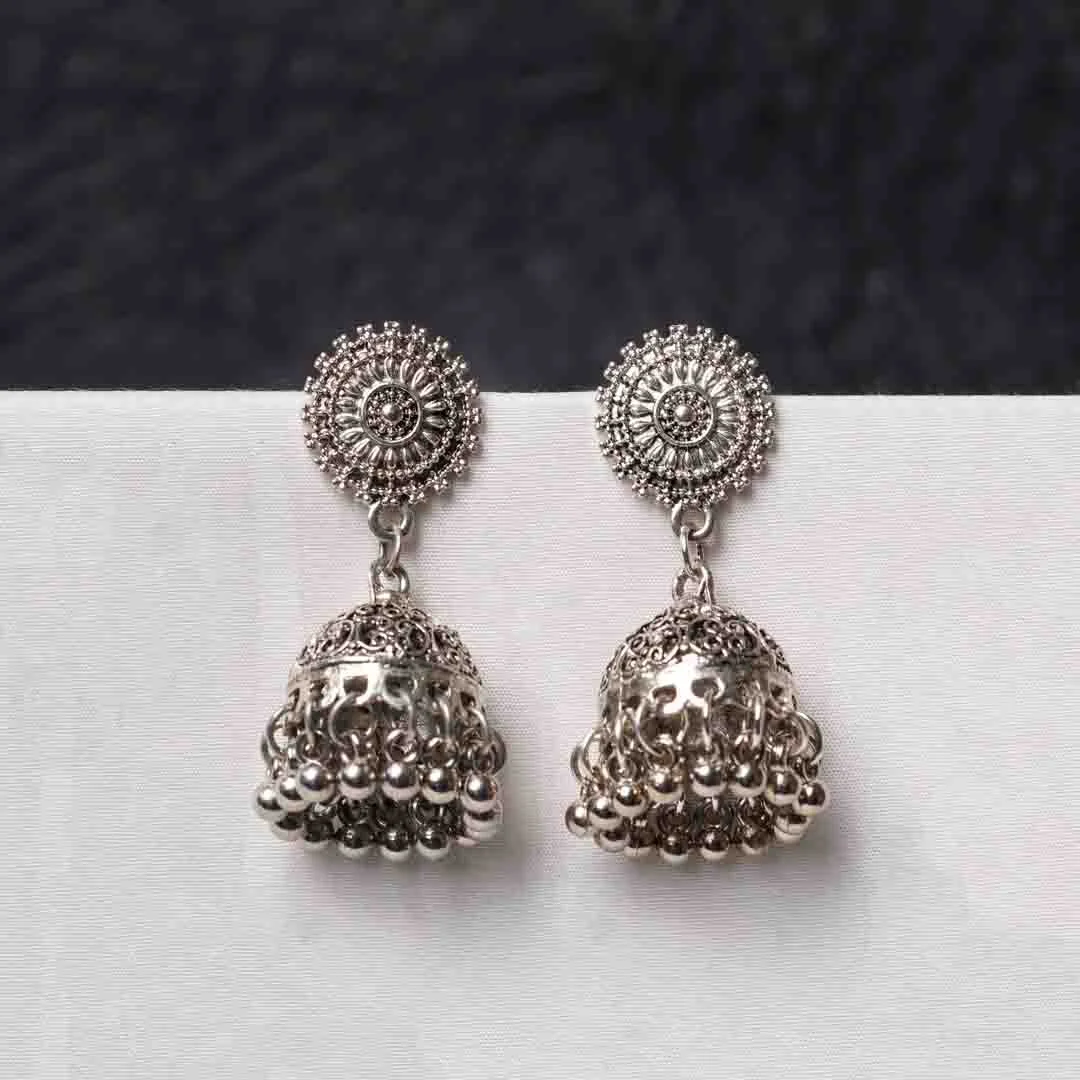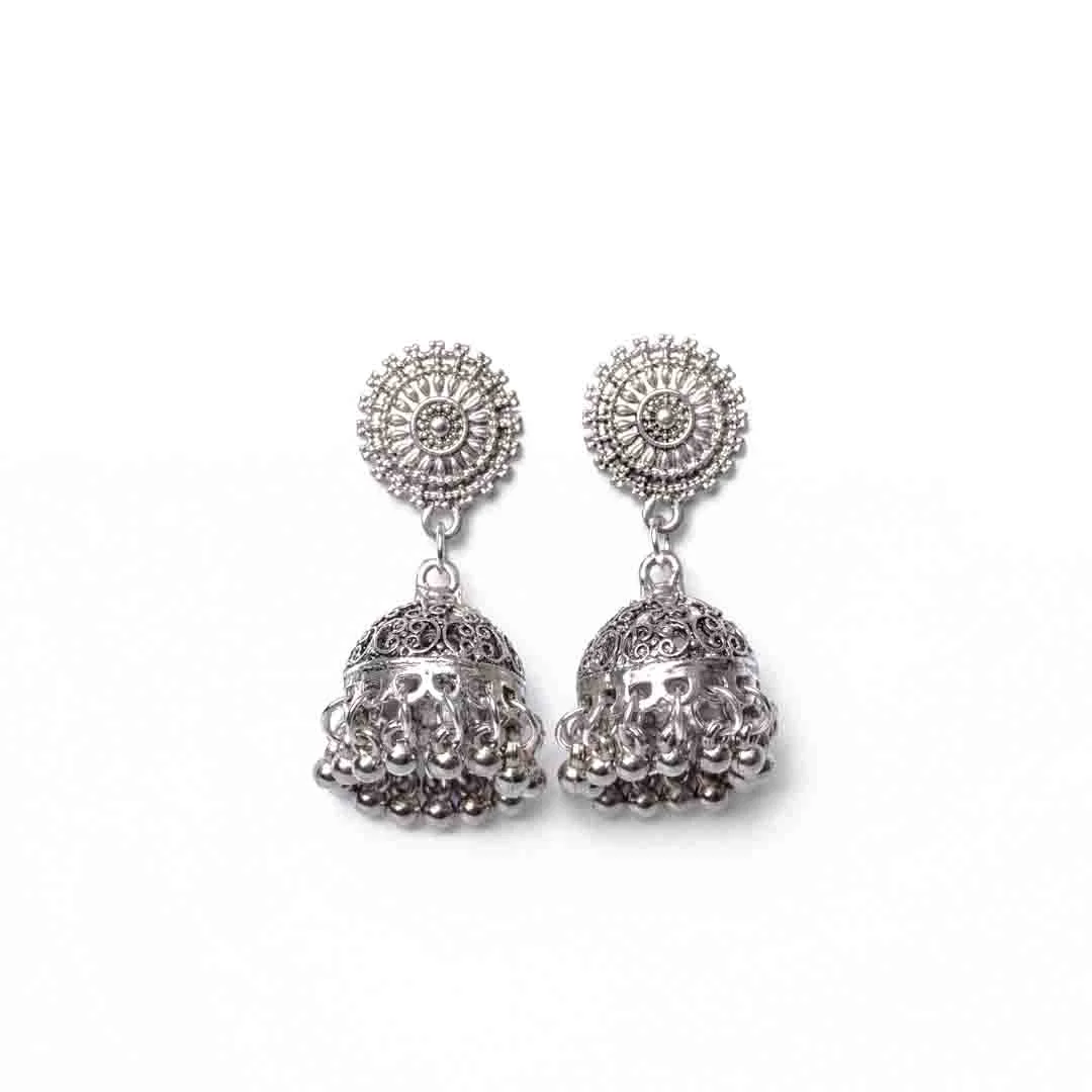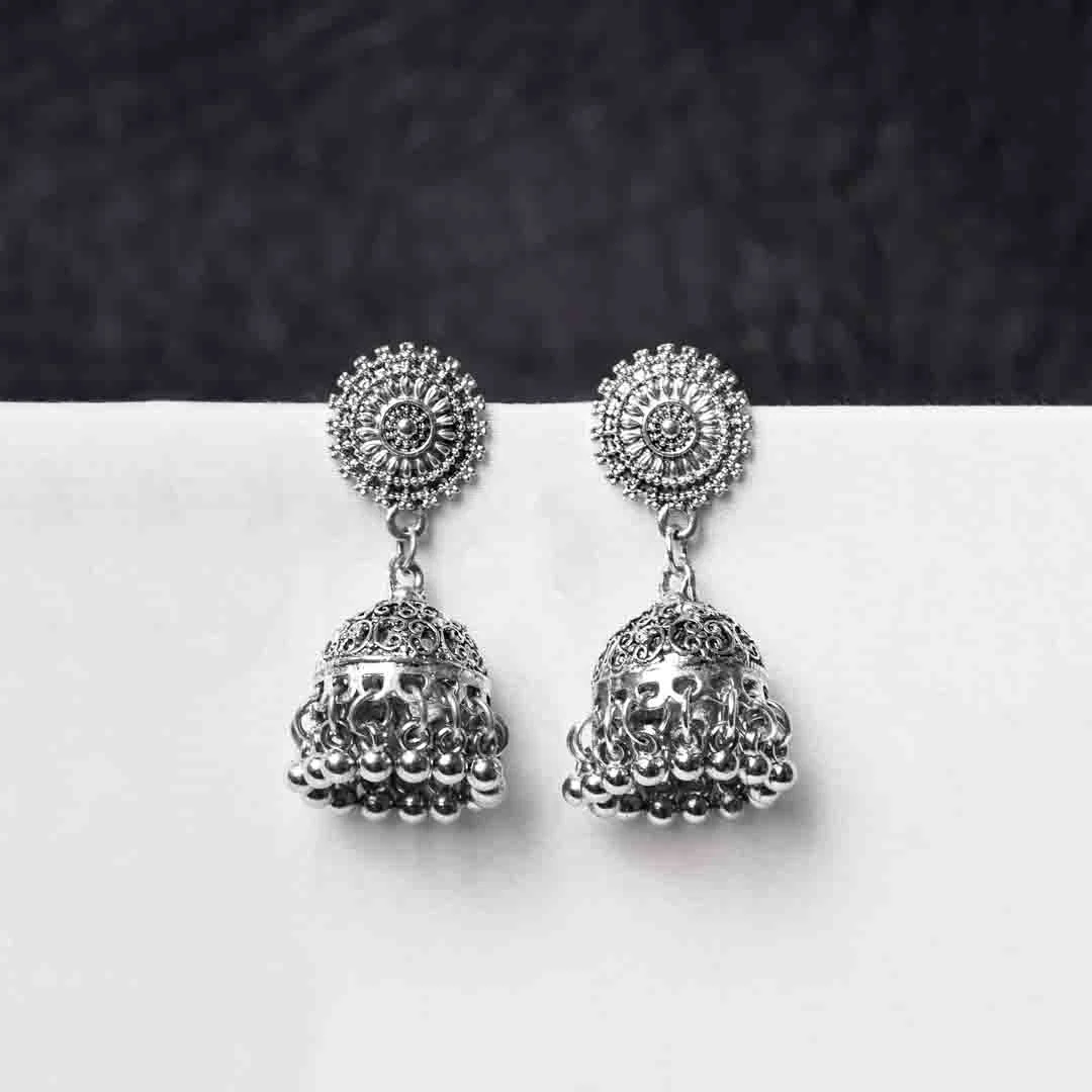 Metal jhumka earring with fine inricate detailing and textured floral designed top with oxidised silver-tone finish adorned with ghungroos at the bottom and a push back closure