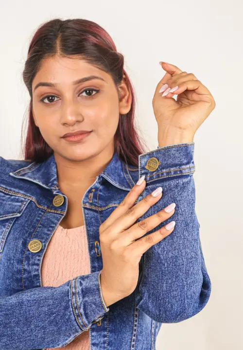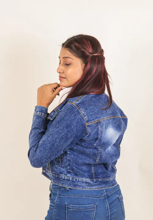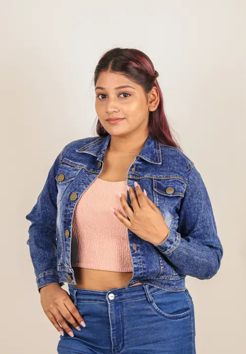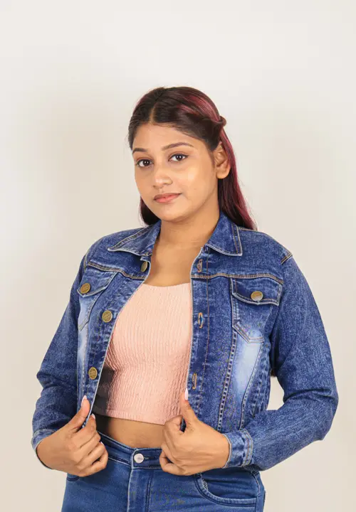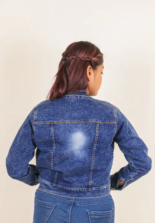 Classic colour name cropped denim jacket featuring details like a button-up front, regular collar, full sleeves and flap pockets. The cropped denim is a structured flattering fit. A perfect casual cool look. It pairs well with every outfit with its easy to go style and adds versitality.