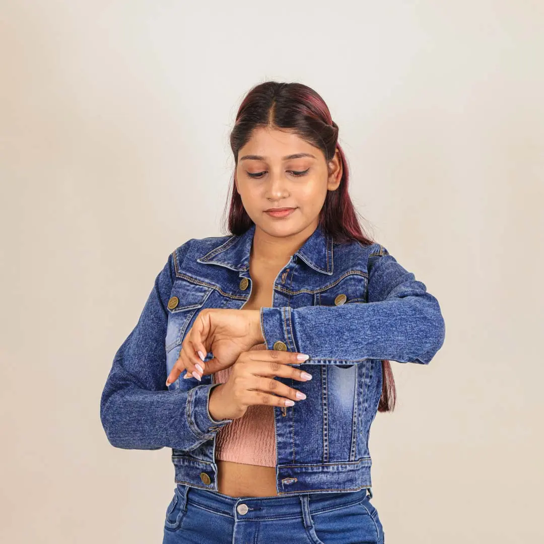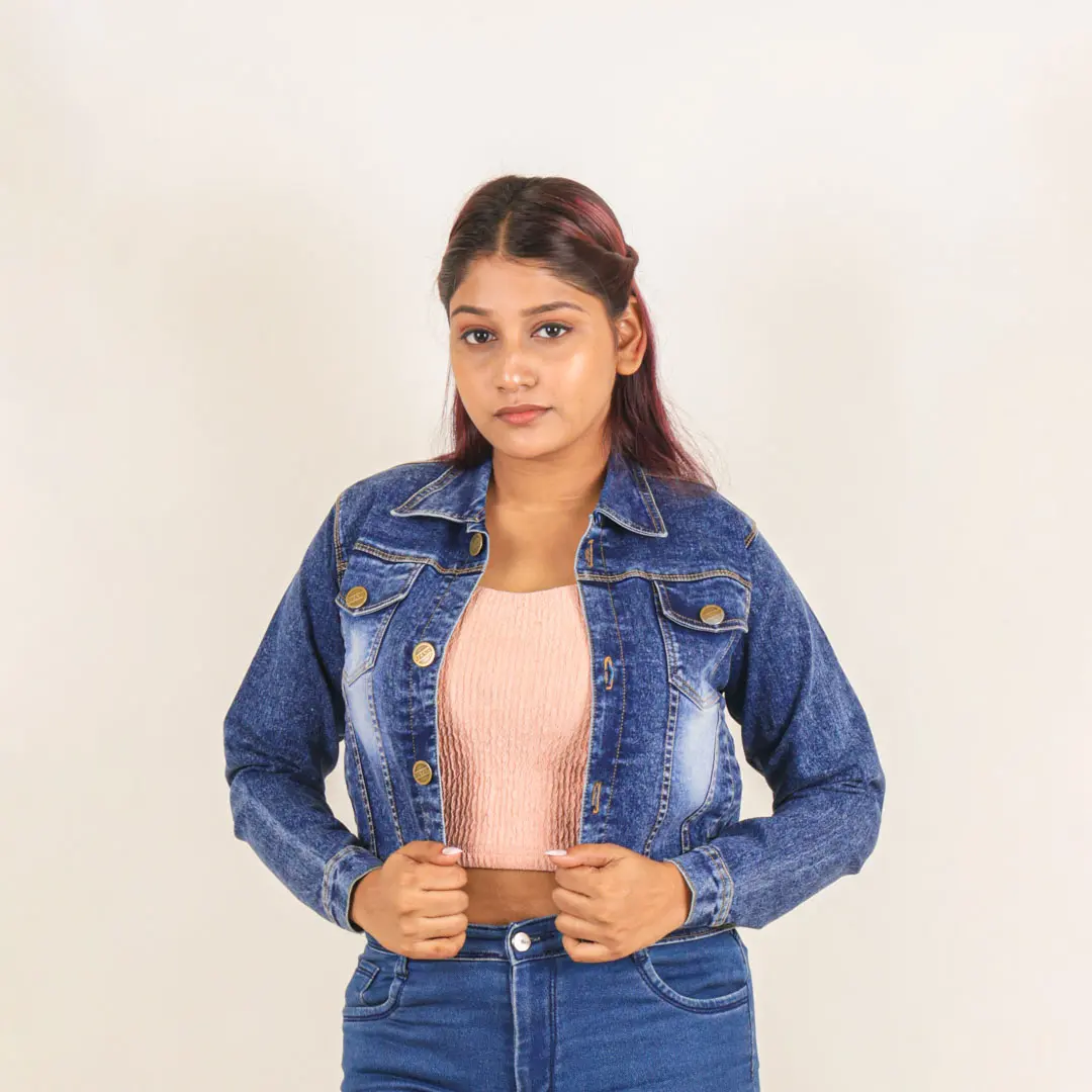Classic colour name cropped denim jacket featuring details like a button-up front, regular collar, full sleeves and flap pockets. The cropped denim is a structured flattering fit. A perfect casual cool look. It pairs well with every outfit with its easy to go style and adds versitality.