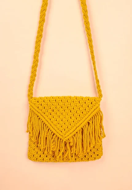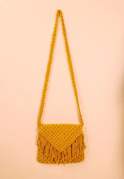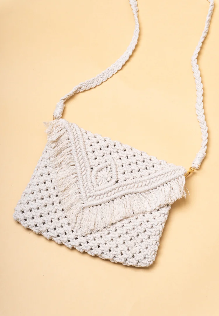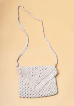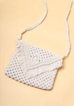 Knitted macrame sling bag with white colour cords adorned with tassels