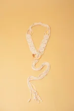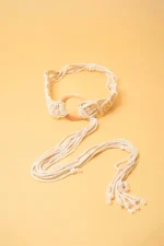 Macramé belt in bright white color featuring intricate knotted patterned design on one end and long free-hanging braided cords on the other with a wooden ring buckle in the center